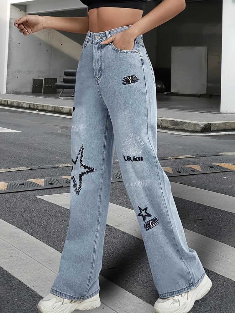 Fashion boyfriend jeans for women, features with the star and letter print, adds a unique and fun touch to your outfit, cute women's y2k athletic streetwear