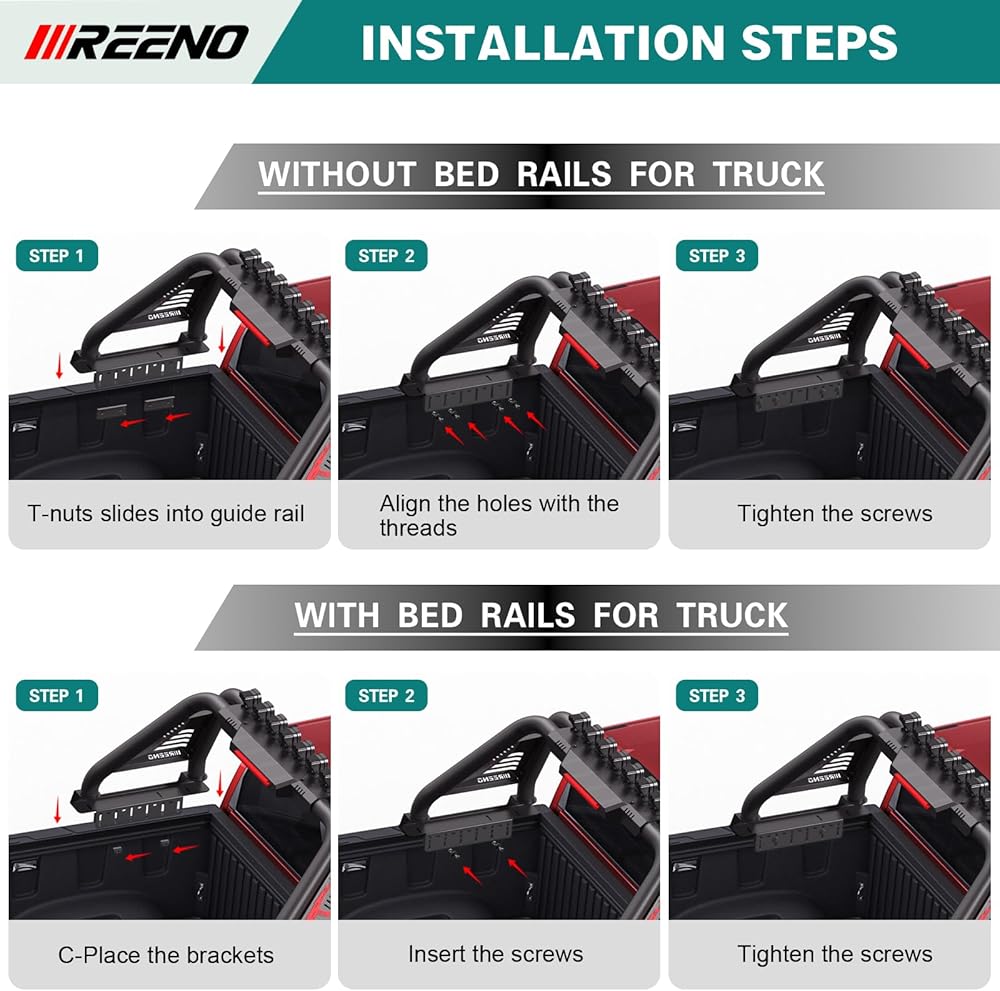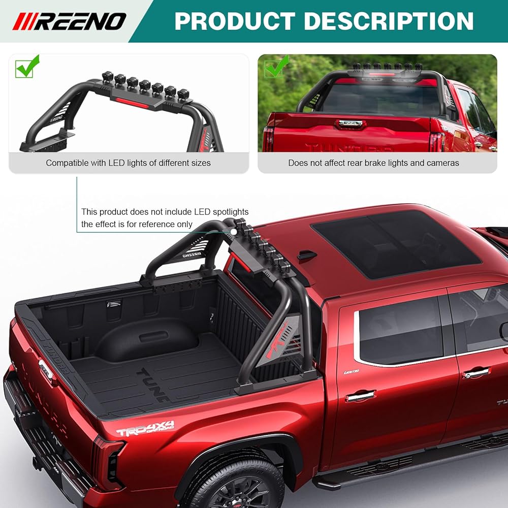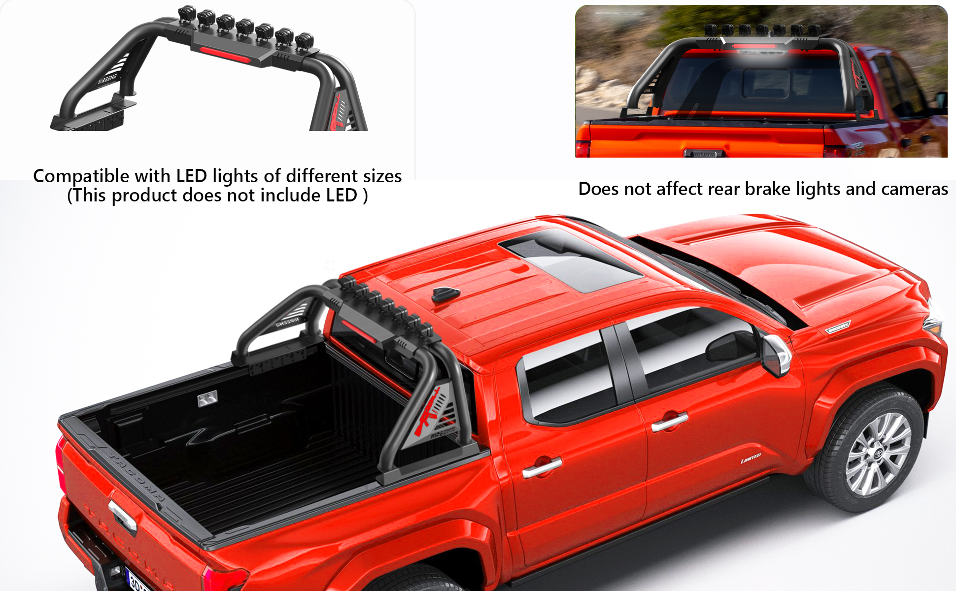 【Design Concept 】Sport Bar for truck is a versatile accessory designed for all your lighting needs,The design ensures compatibility and non-interference with factory 3rd brake lights. Light mount brackets for aftermarket LED light bars are provided (Lights NOT included).