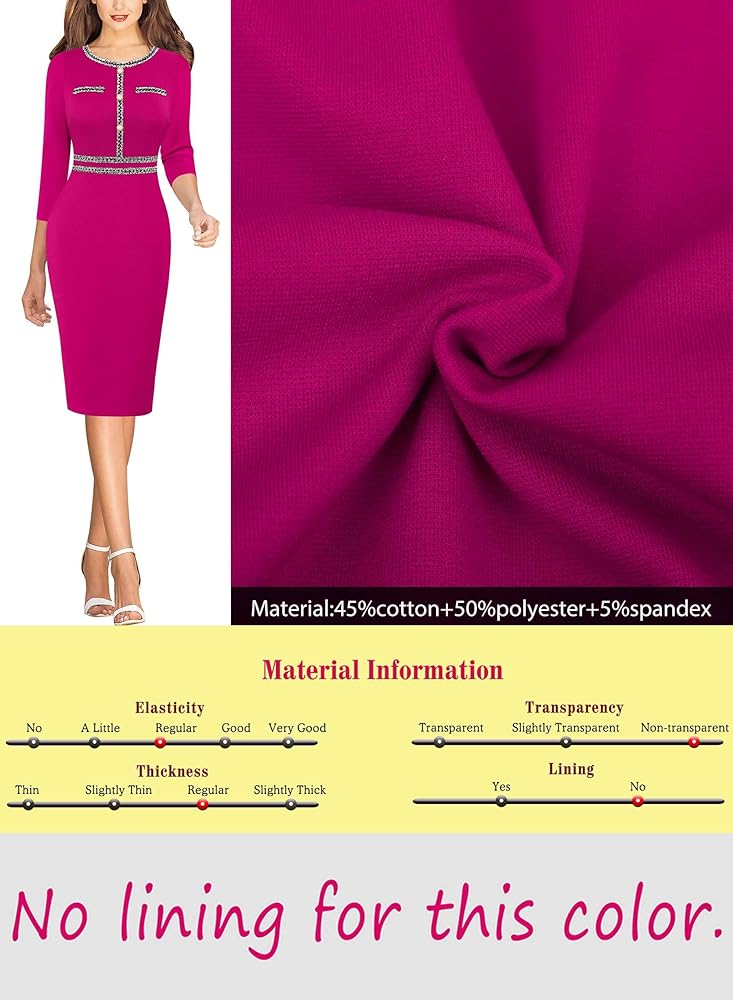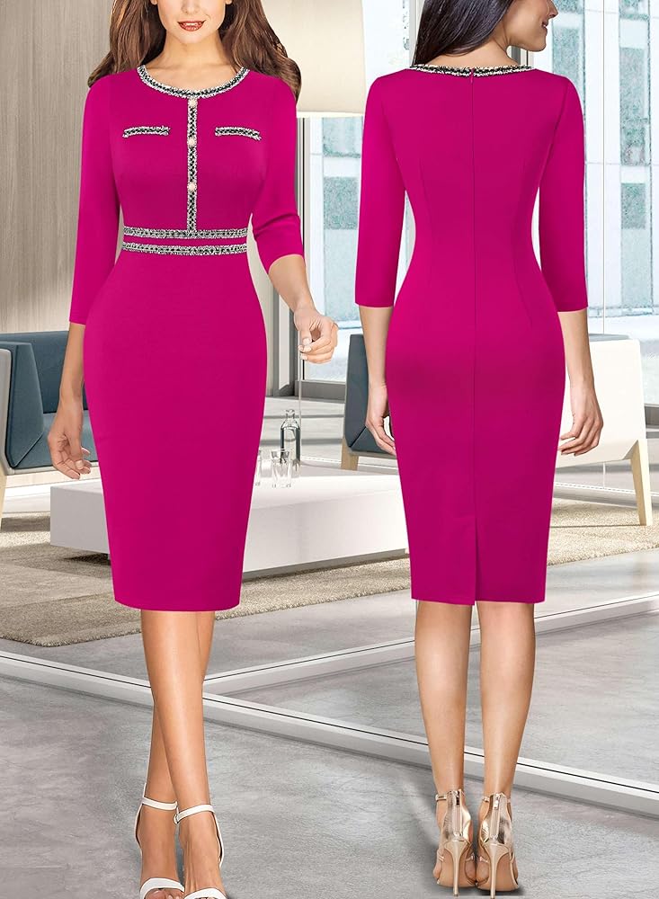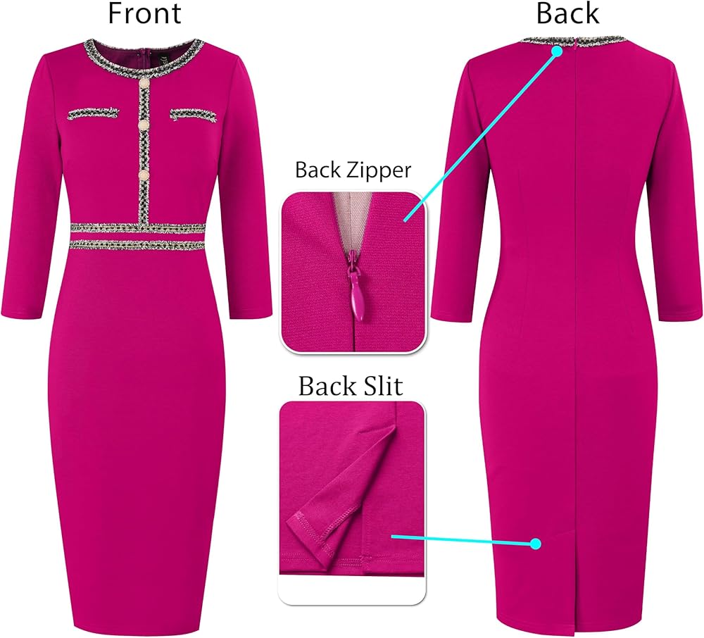 Style: Round Neckline, Decorative Buttons, Tweed Trim design with Metallic Stitching detail, 3/4 sleeves, Bodycon silhouette with a Concealed Back Zipper, Back Slit for easy walking.