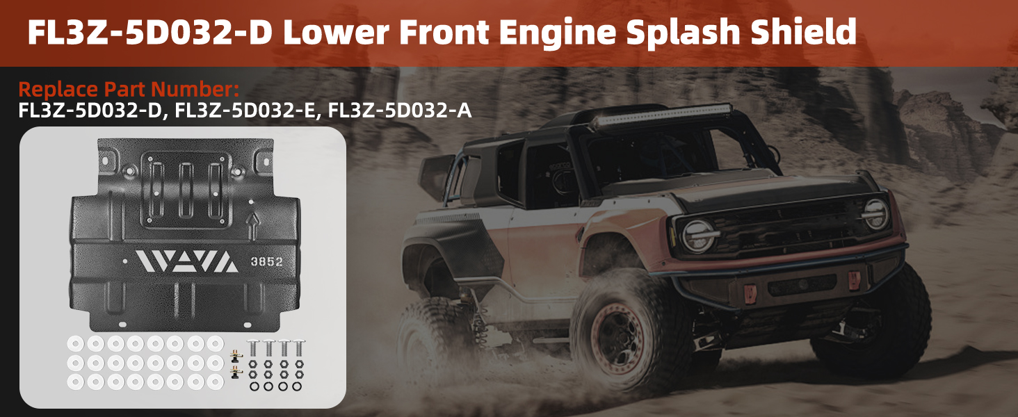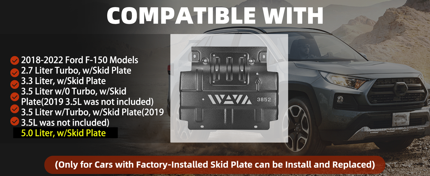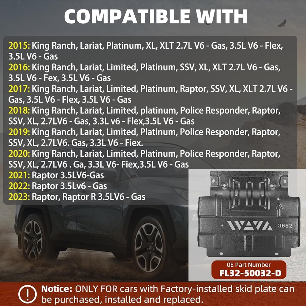 【Compatible】FL3Z-5D032-D lower front engine splash shield compatible with 2015-2022 Ford F-150 2.7L 3.3L 3.5L engine. (For vehicles where factory installed skid plates can be installed and replaced). Not supported 2019 F-150 3.5L models. This Ford-150 engine splash shield guard also replaces part numbers FL3Z-5D032-E, FL3Z-5D032-A lower front splash guard. Please check the model number before purchasing