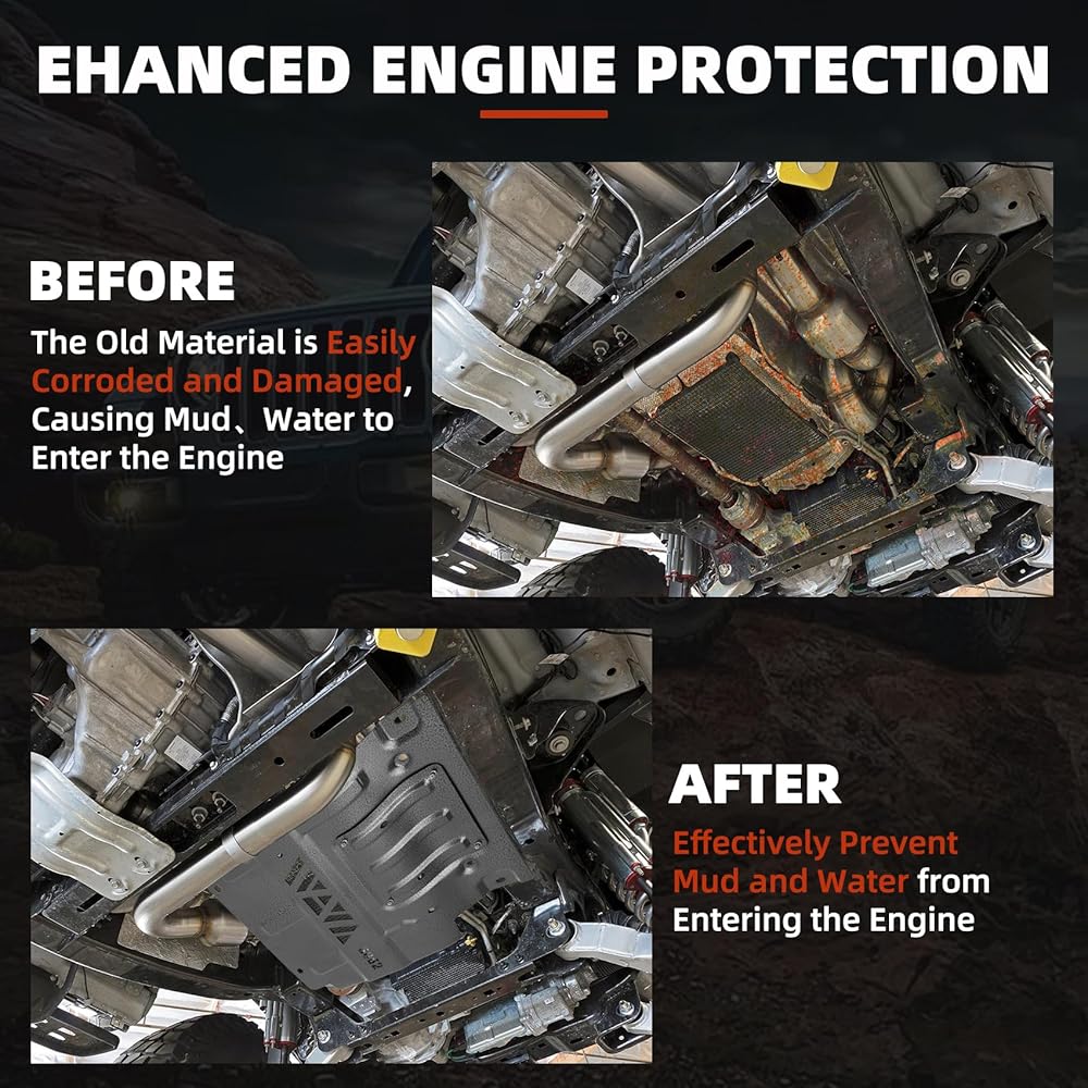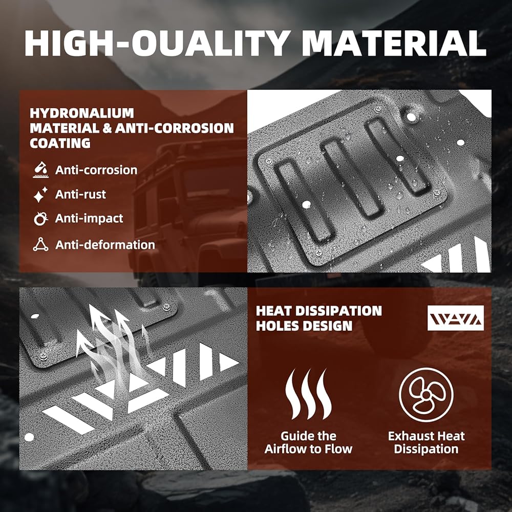 【Exhaust Heat Dissipation】This engine splash guard features a unique vent design that promotes air flow and directs airflow quickly through the inlet and outlet vents to dissipate heat generated by the engine. At the same time, the differently shaped holes prevent mud and stones from entering the engine compartment and damaging the engine