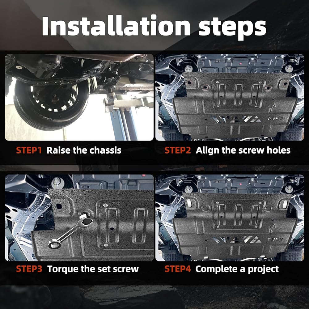 【Installation】The Ford-150 engine splash shield guard is very easy to install, simply raise the chassis to remove the damaged skid plate or engine splash guard, align the screw holes and tighten the set screws to complete the installation and use