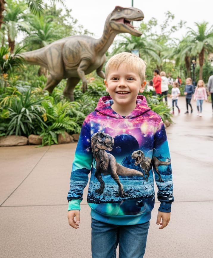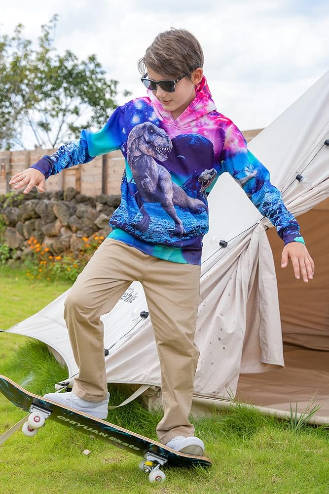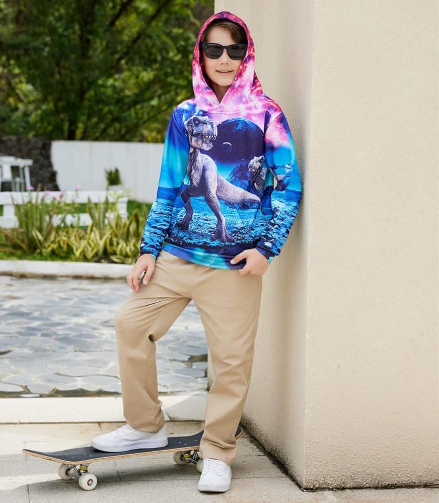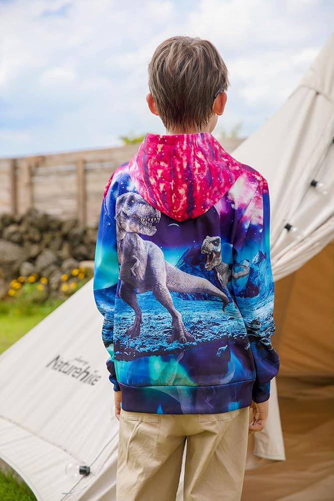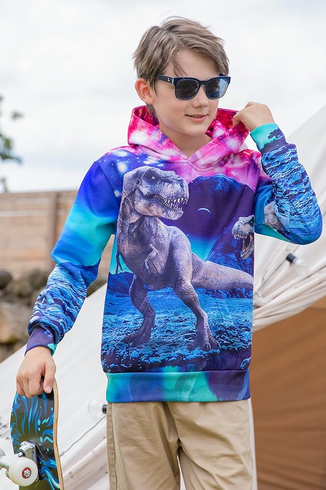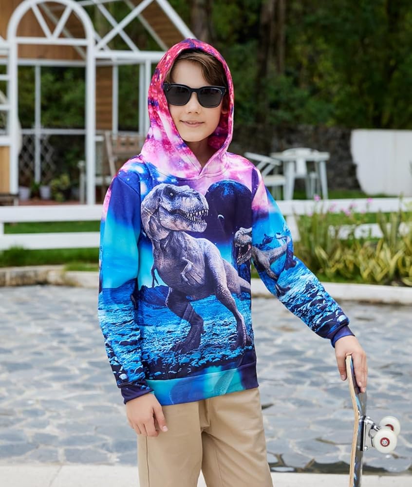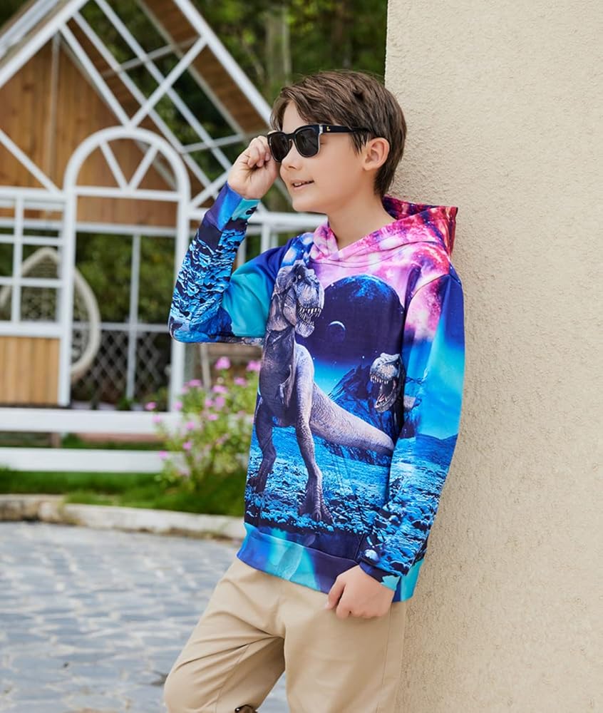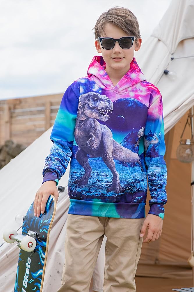 Features: The high-tech 3D all-over print technology pullover sweater has a clear pattern and is not easy to fade.The clear and bright print design of the Hoodied Sweatshirt makes your children dazzling in the crowd. Many cool graphics available: dinosaurs, galaxies, cats, wolves, flames, sharks and more