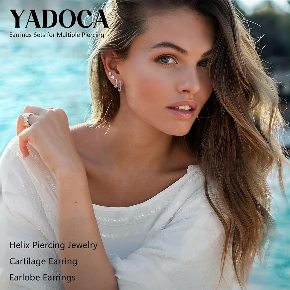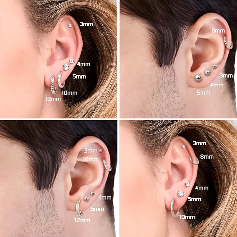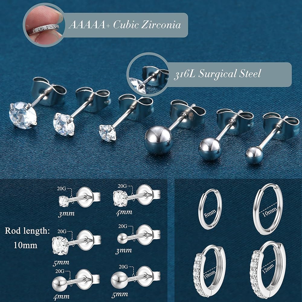 【Earrings Sets for Multiple Piercing】--1 order you will get 10pairs hypoallergenic earrings, including 6 pairs of small stud earrings of different design and sizes, 2 pairs of small huggie hoop earrings and 2 pairs cubic zirconia hoop earrings. It can be worn individually or stacked, used as cartilage earring, helix piercing jewelry, lobe earring, multiple earrings to match your ears flexibly.