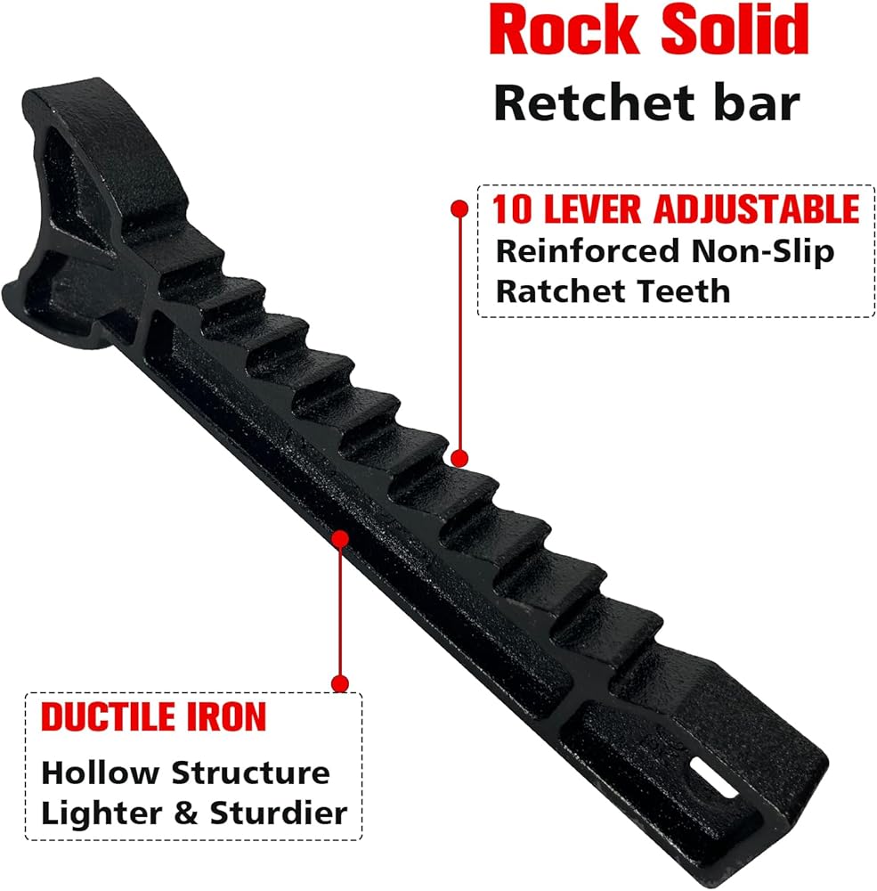 【Adjustable Ratchet Bar】: The multi-position ratchet bar is made of high-quality cast ductile iron, thickened and forged in one piece, which is durable and not easy to break. The ratchet bar adopts a serrated design, which can be easily and quickly adjusted to the required height and locked in place, allowing DYI enthusiasts or mechanics to maintain or repair cars safely and happily.