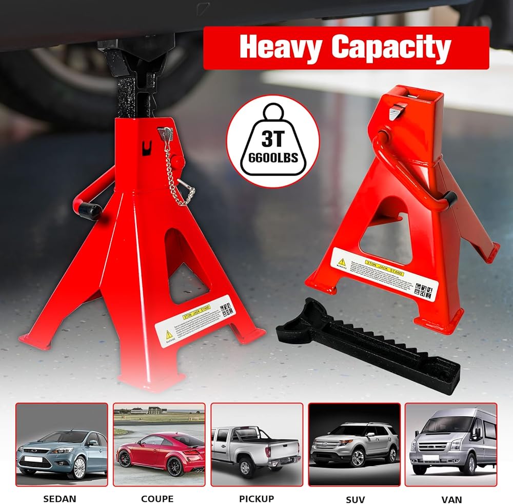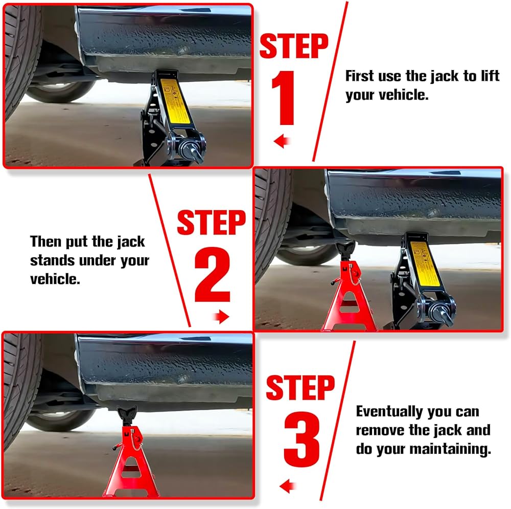 【Double Safety Design】:Prioritizing safety during repairs, our car jack stands 3 Ton are designed with a dual safety mechanism, featuring a handle adjustment locking ratchet bar and a metal removable safety pin. The removable locking support pin provides additional security, increasing safety by 200%!