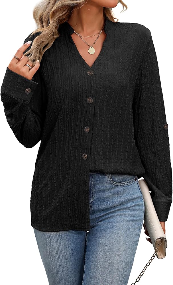 Unique Design: V-neck,long-sleeved shirt, relaxed loose fit,stylish pleated texture, 2024 trend long-sleeved button-up women's shirt, let you look more stylish,free