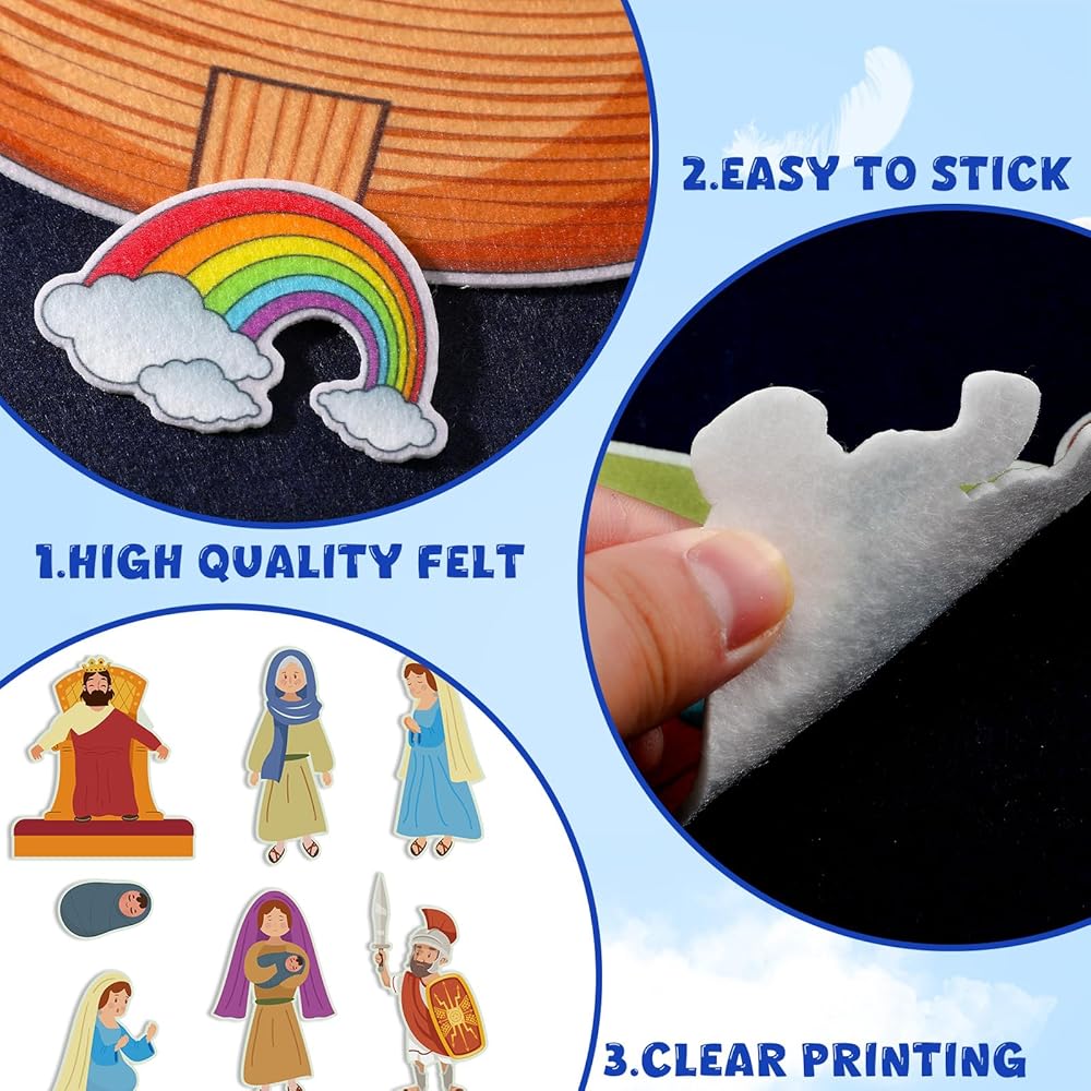 Versatile Applications: the felt story pieces are multifunctional and versatile in its applications; Ideally suitable for different settings such as Sunday school classrooms, kindergarten, daycare centers, homes, or family gatherings; These story felt sets introduce fun, interactive, and captivating learning to any setting you choose