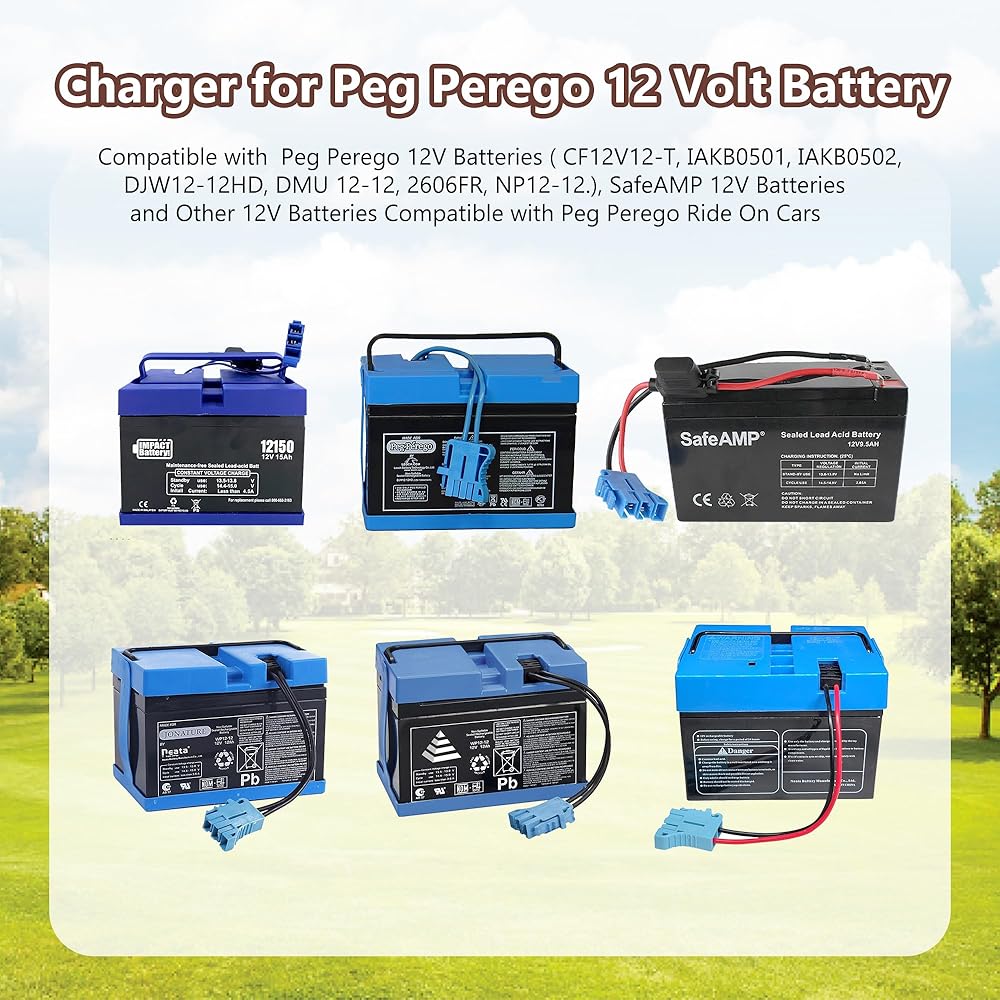 Power Wheels 12V Battery Charger for Peg Perego 12V Batteries (CF12V12-T, IAKB0501, IAKB0502, DJW12-12HD, DMU 12-12, 2606FR, NP12-12), SafeAMP 12V Batteries, Other After Market 12V Batteries Compatible with Peg Perego Ride On Cars