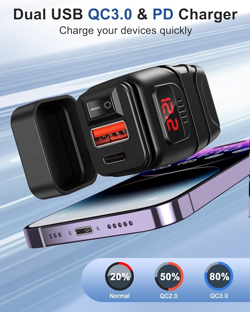 QC3.0 Motorcycle USB Charger: The motorcycle phone charger is equipped with 24W USB-A (Quick Charge 3.0) dual port. You are charging a phone or up to 50% capacity in just 30 mins. You can charge two devices at the same time.