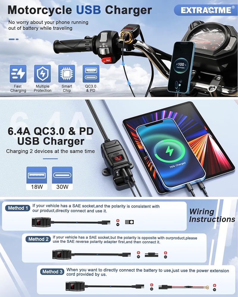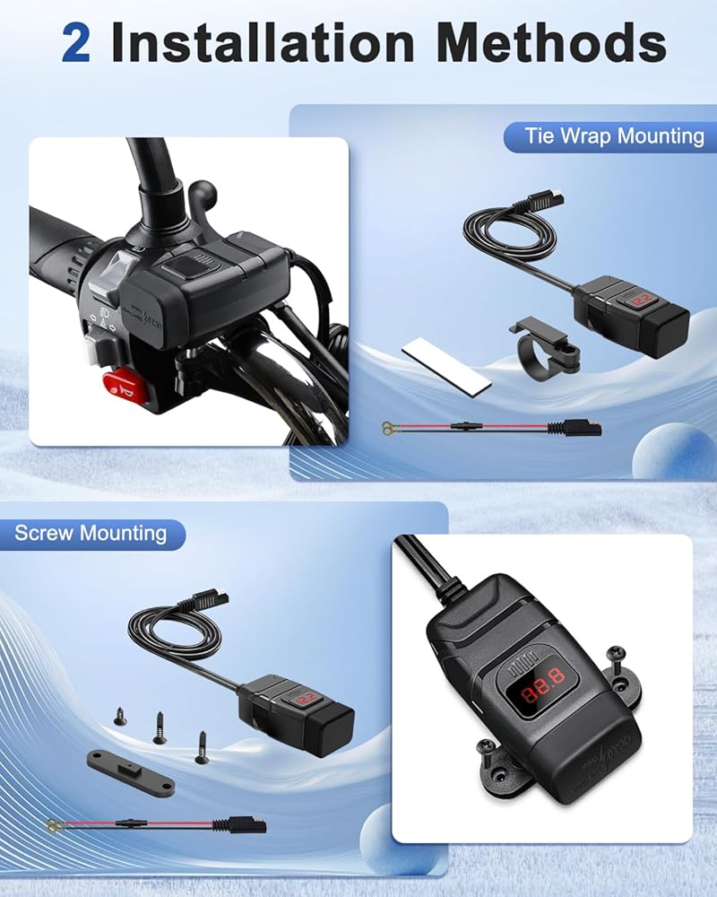 Motorcycle SAE to USB charger: The product is designed with one SAE interface, which can be used directly with the original SAE interface, Also equipped with a 10A fuse SAE to ring terminal harness, which can be directly connected to the battery, making the installation more convenient.