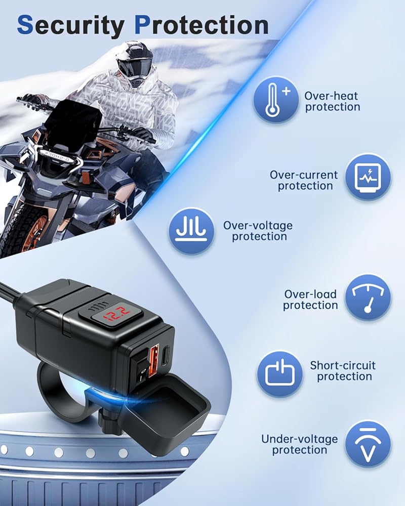 Safe & Reliable: Built with high-grade ABS materials against scratching. Intelligent IC technology to maximize the charging efficiency, 2 Port USB A motorcycle phone charger with strict control tests ensures safe charging. It offers a great protection system against short-circuiting, over-heating, over-current, and over-charging.