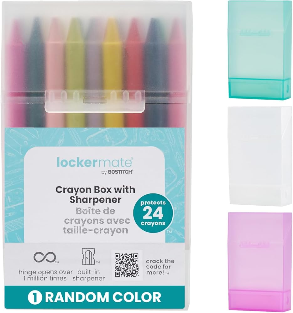 No more lost or broken supplies with the Lockermate by Bostitch Crayon Box with Crayon Sharpener! Protect and secure your supplies and make sure that your crayons stay sharp all school year long. This box fits and sharpens 24 standard-size crayons and comes in a variety of fun colors to store your crayons in style! Keep your desk or backpack neat and tidy with no scattered crayons all over the place. The snap closure makes sure your crayons will stay put, and the hardcover keeps them from getting dented and broken. The sharpener slides off and on for easy disposal of crayon shavings. Perfect for use at home or in school! Comes in assorted colors selected at random.