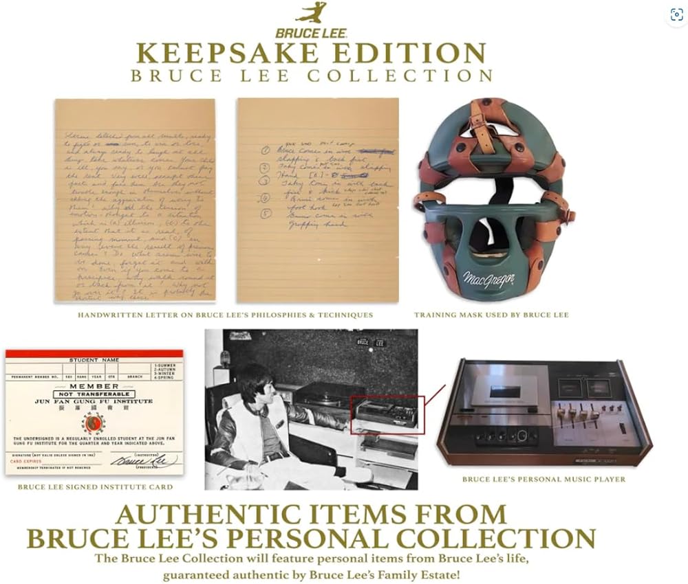 The Bruce Lee Keepsake Collection offers a unique chance to connect with the martial arts legend. Each box contains a genuine relic item from Bruce Lee such as personal relics and officially licensed collectibles. Expand your collection with Bruce Lee trading cards and display your prized relic in style with the included stand and light-activated box. Become a Legend with the Bruce Lee Keepsake Collection!