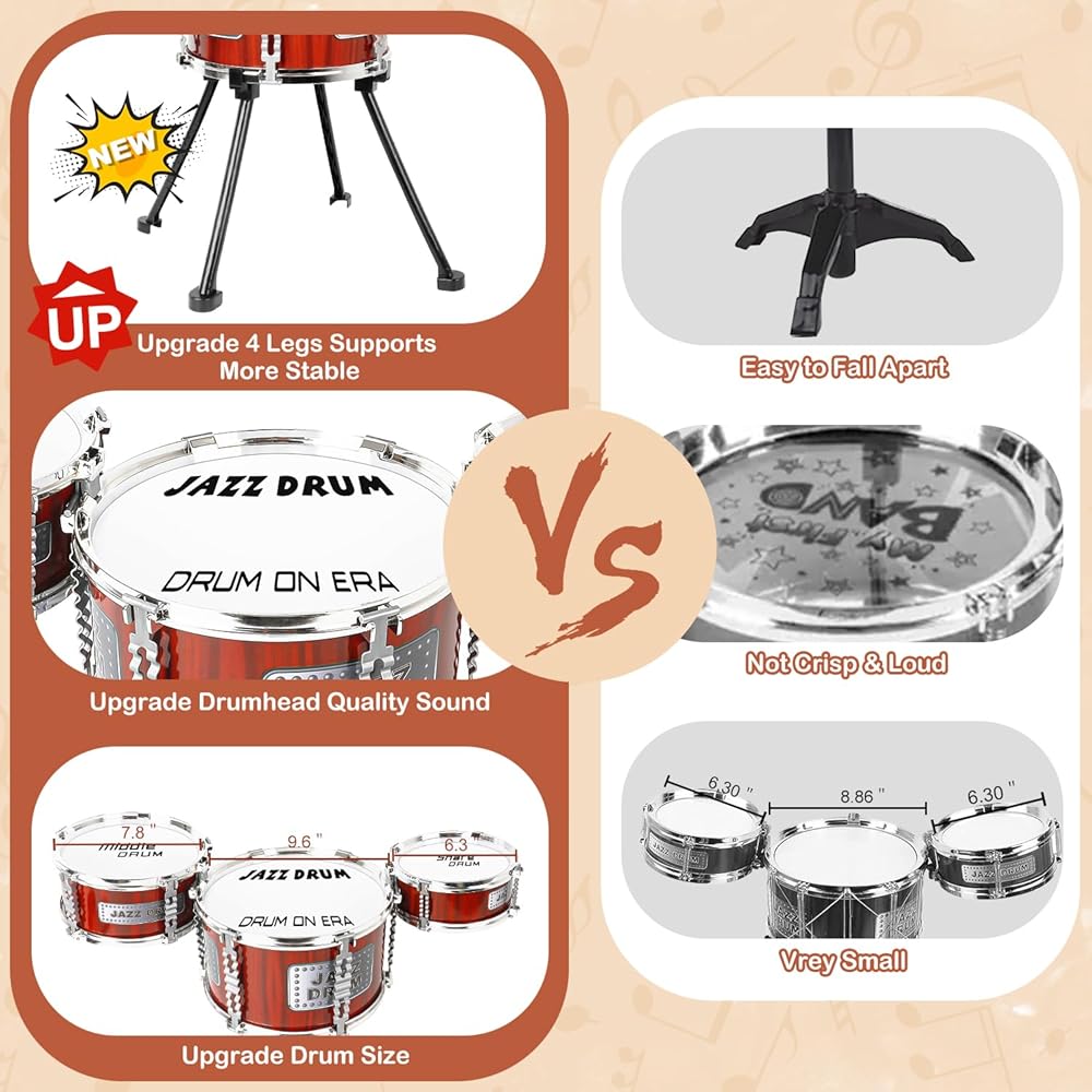 Upgrade Drum Set for Toddlers: After comparing the existing kids drum set toy on the market, we've made a lot of practical updates to keep kids playing longer. The new structure enhances stability and prevents falling apart. This drum set kit is ideal for toddlers aged 3-5 who want to explore the world of percussion.