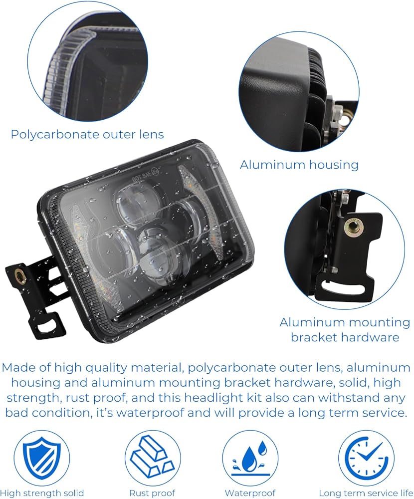 [HIGH QUALITY MATERIAL] Made of high quality material, polycarbonate outer lens, aluminum housing and aluminum mounting bracket hardware, solid, high strength, rust proof, and this headlight kit also can withstand any bad condition, it's waterproof and will provide a long term service.