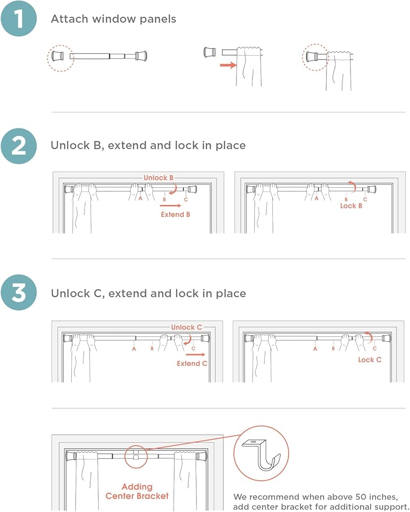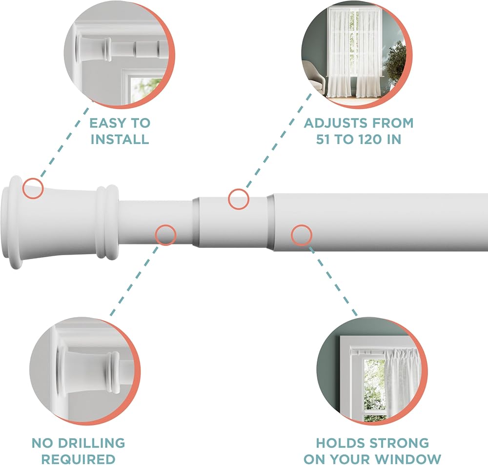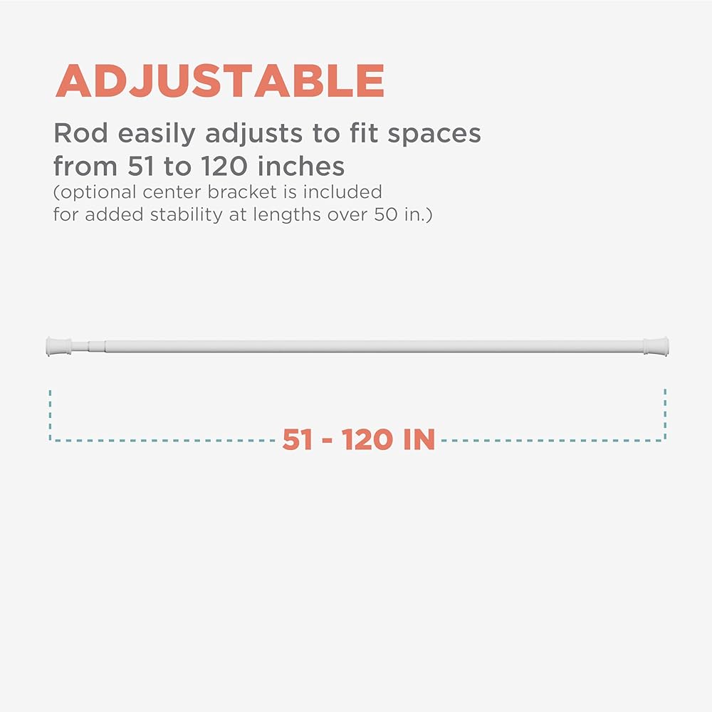 Fits Wide Windows with Superior Hold: The adjustable tension mechanism provides a secure fit for window panels from 51 to 120 inches wide; includes an optional center bracket for extra stability on longer spans, ideal for easy install curtain rods.