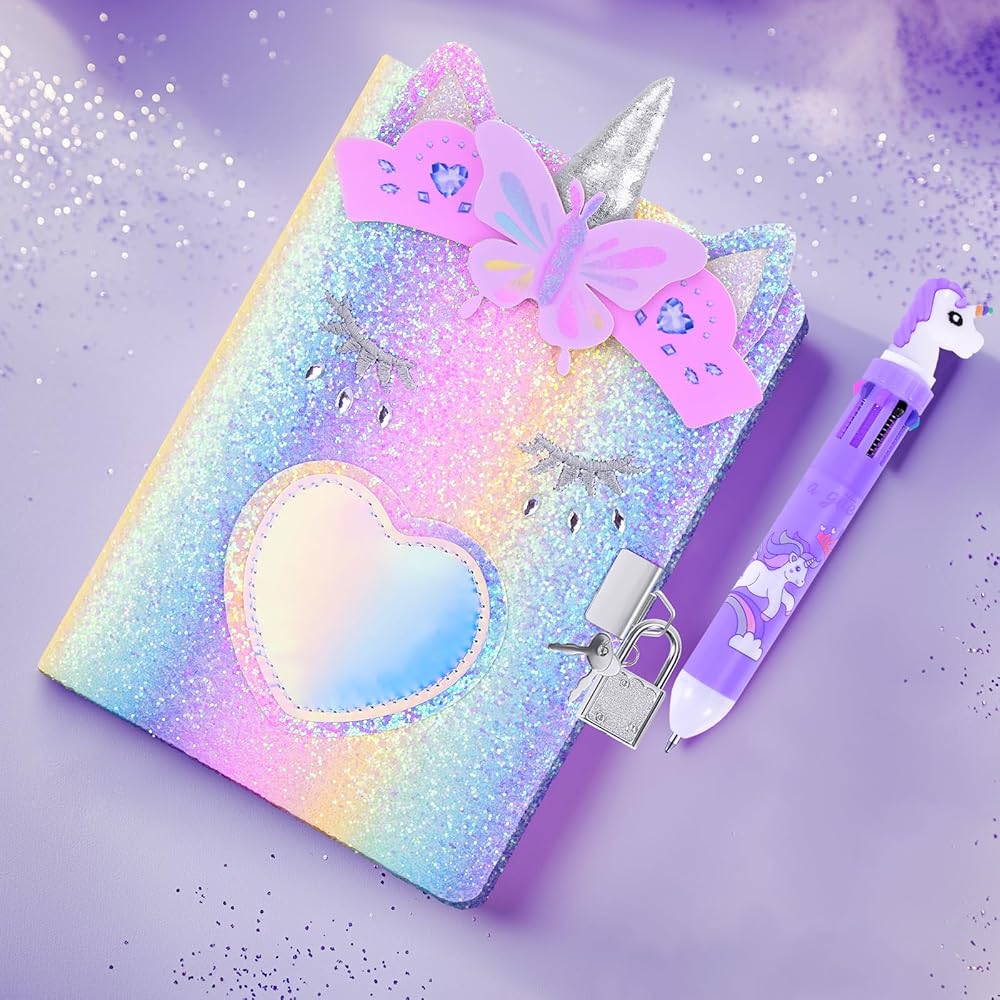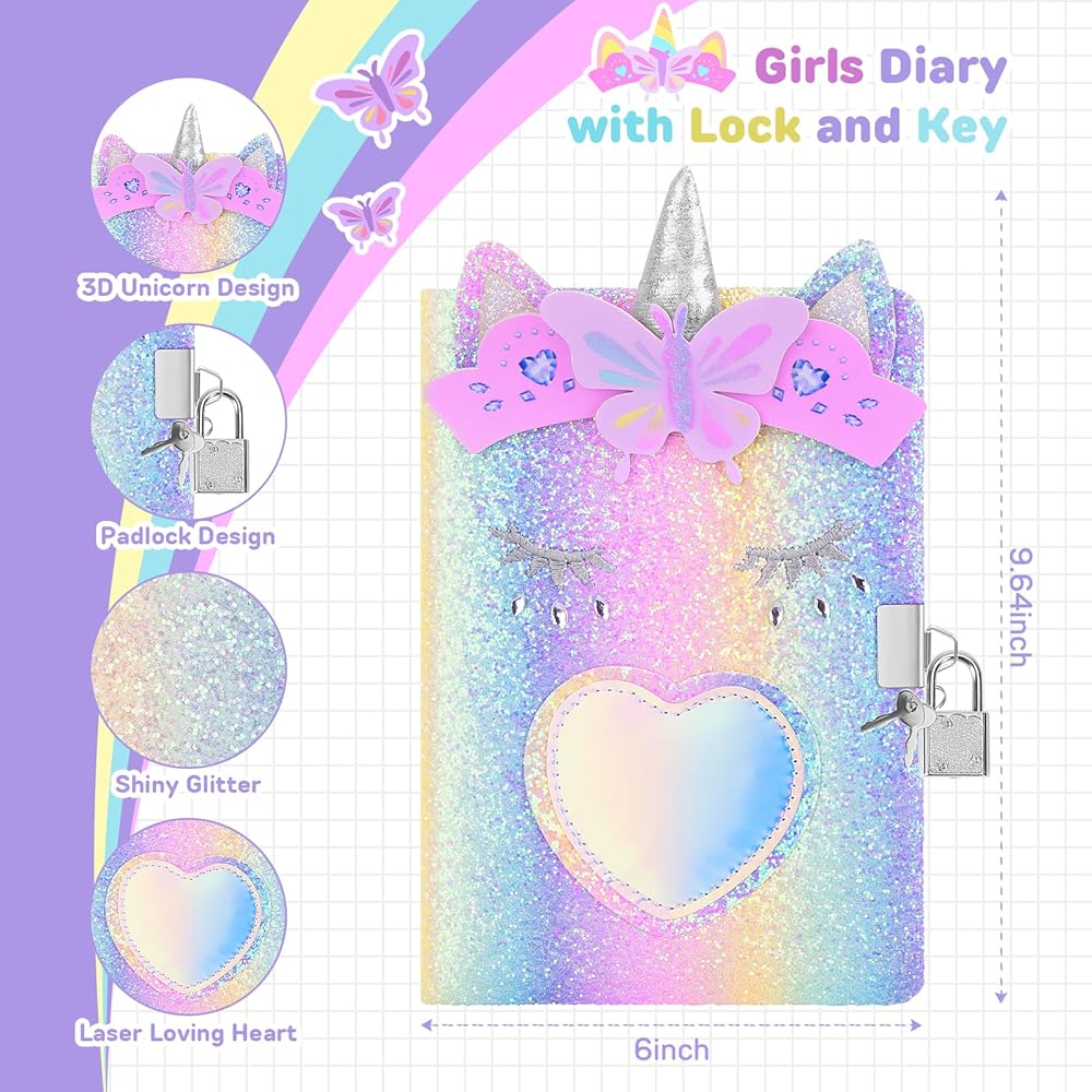 Unleash your child's creativity with this enchanting kids journal,a perfect gift for young girls,writers, dreamers. The beautifully crafted cover features intricate unicorn and butterfly designs brought to life through a combination of exquisite techniques, including holographic, glitter texture, embroidery, and sequins. This attention to detail creates a magical experience that invites girls to explore their imaginations and express themselves freely. Inside, 160 well-bound, lined pages provide ample space for your child to pen down her thoughts, dreams, stories, and sketches.The high-quality paper ensures a smooth writing experience, while the strong binding keeps everything securely in place.This A5-sized girls journal is lightweight and portable, making it perfect for on-the-go journaling, whether at home, school,or during travels. The girls notebooks and journals is not just a creative outlet but also a secure space for personal reflections Equipped with a sturdy metal lock and two keys, it offers a safe place to keep secrets and private thoughts.The lock is easy to use, providing peace of mind that her musings will remain confidential. This diary with lock for girls is more than just a notebook;it's an invitation to embark on a creative journey.It's an ideal gift for birthdays, holidays, or any special occasion, sure to inspire a lifelong love of writing and storytelling. Gift this charming diary to the special girl in your life and watch her creativity soar!