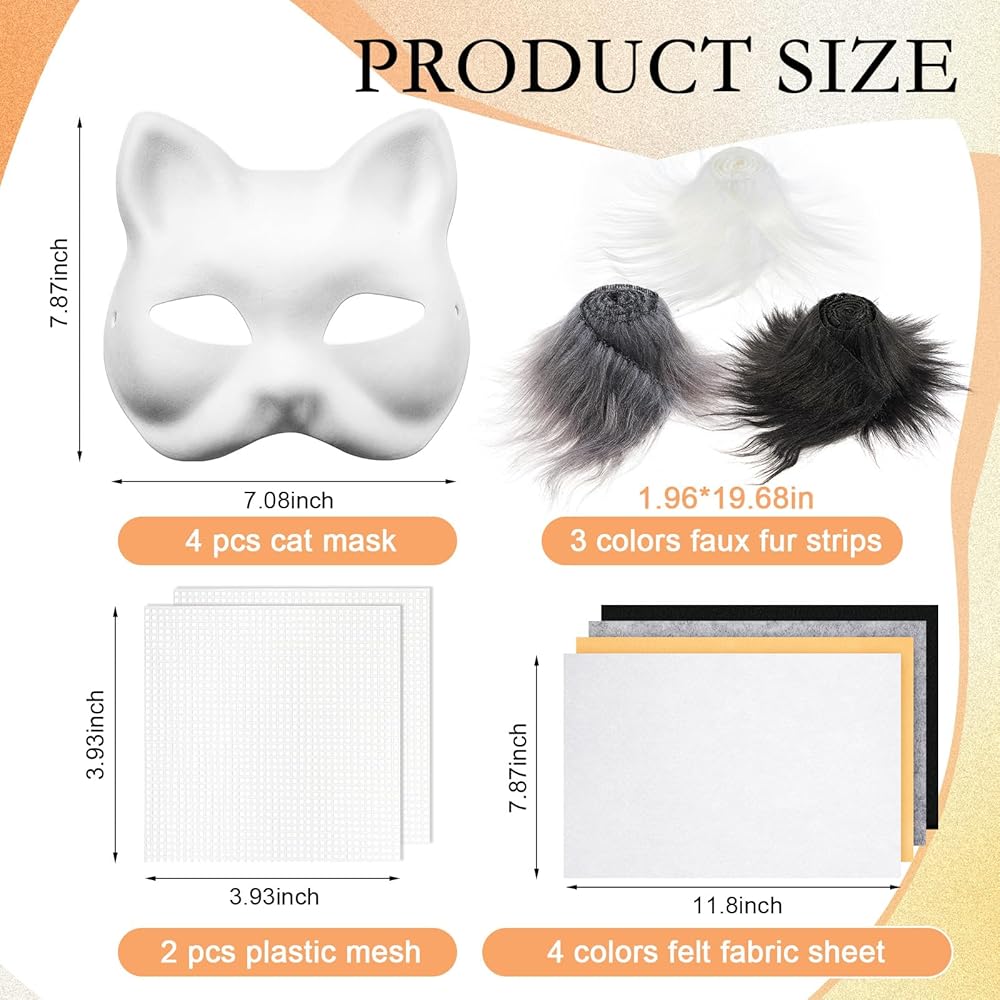 Complete Therian Mask DIY Set: we provide you with 6 paper cat masks, 10 sheets of felt fabric sheet measuring about 7.87 x 11.81 inches/ 20 x 30 cm, thickness about 1 mm, 2 plastic mesh sheets measuring about 3.94 x 3.94 inches/ 10 x 10 cm, 1 set of faux fur fabric precut strip, this is a complete DIY kit, you can dye these into the color you want according to your needs