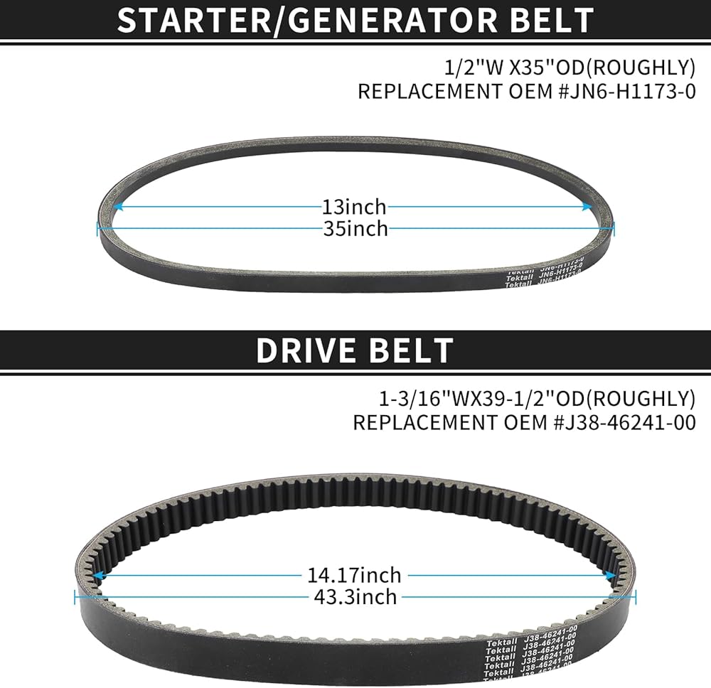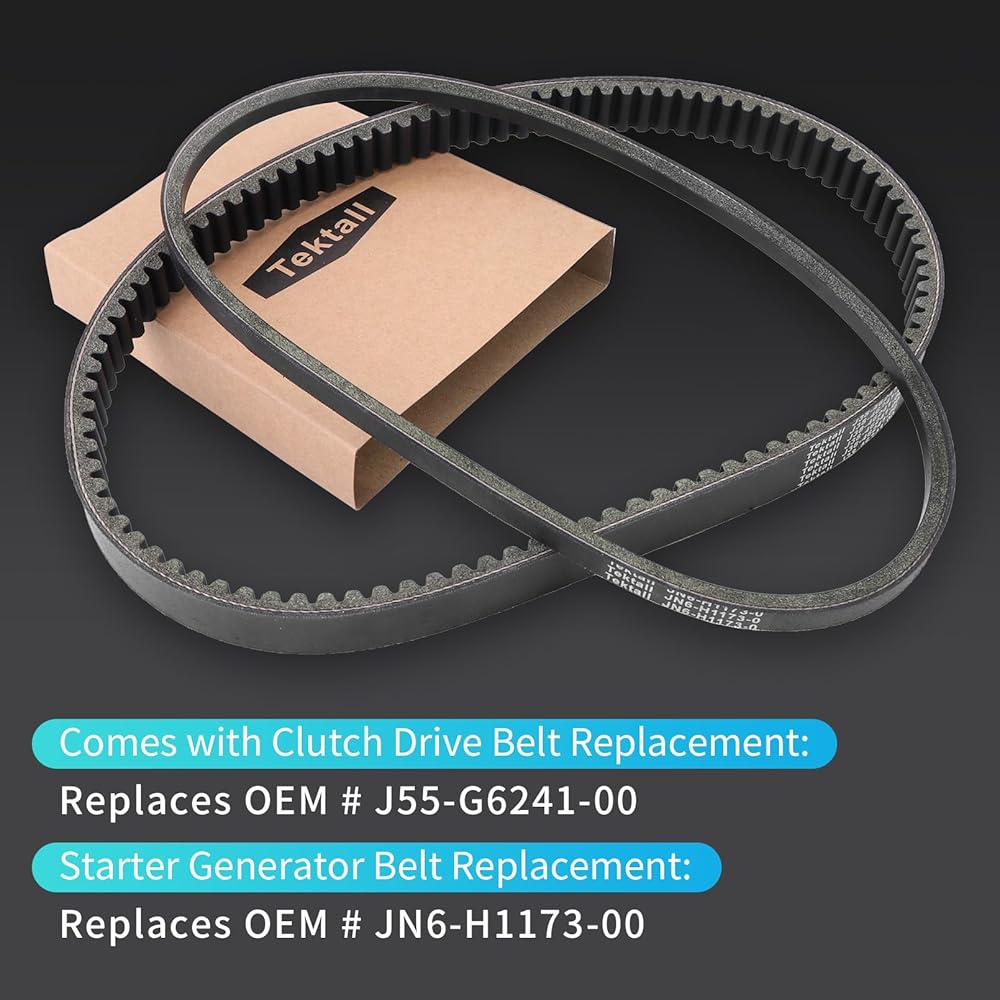 【PACKAGE LIST】1x Drive Clutch,1x Washer ,1x Gasket, 1x Bolt, 1x Clutch Drive Belt, 1x Starter Generator Belt. Clutch Drive Belt Replacement: Replaces OEM # J55-G6241-00, J55-G6241-00-00, J38-462411-00, ( Size: 1-3/16" W × 39" OD ); Starter Generator Belt Replacement: Replaces OEM # J55-H1173-00, J38-81173-00, JN6-H1173-00, ( Size: 1/2" W × 35-1/2" OD )
