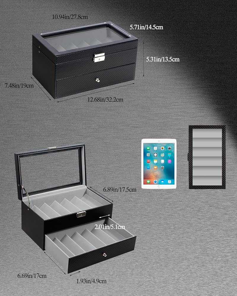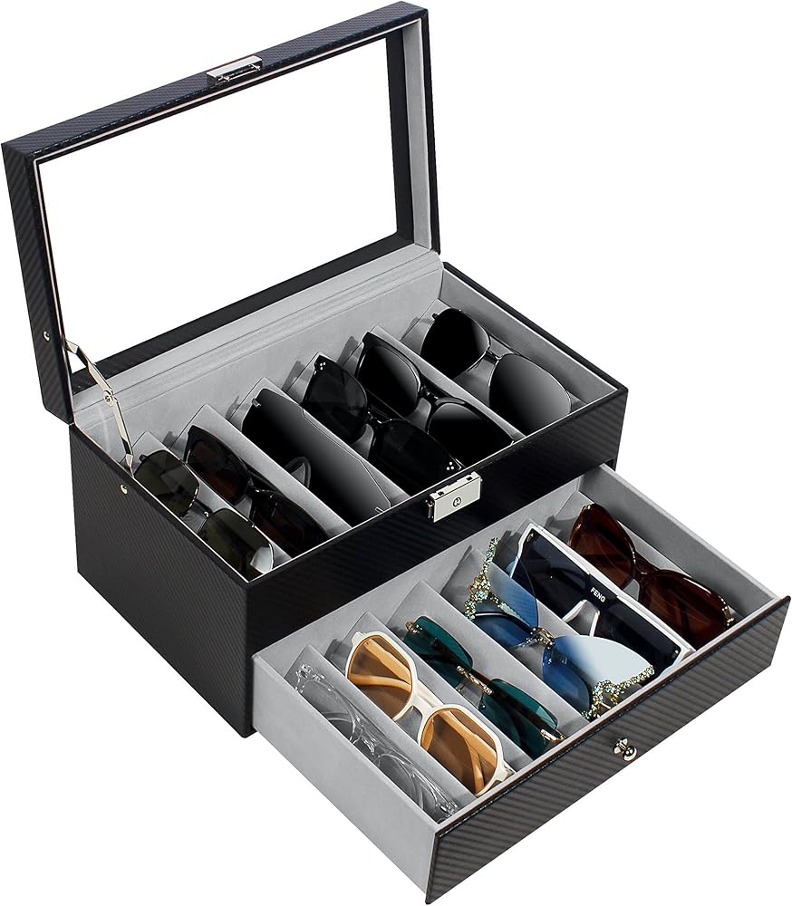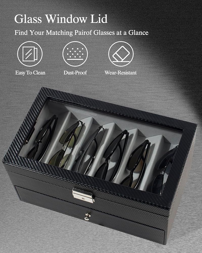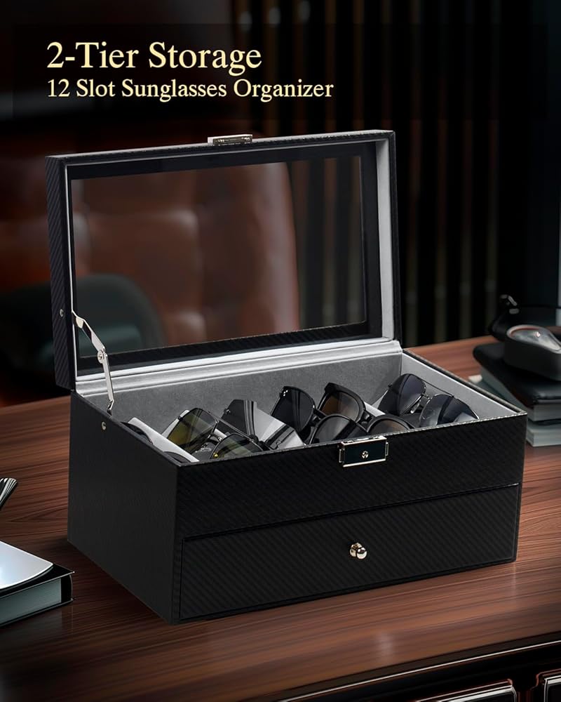 [Sleek 2-Layer Design for Maximum Storage]: This organizer boasts a sophisticated two-layer design that provides ample space to store and display up to 12 pairs of sunglasses or eyeglasses. Its compact structure helps you optimize your dresser or tabletop space, making it a perfect solution for those with a growing eyewear collection