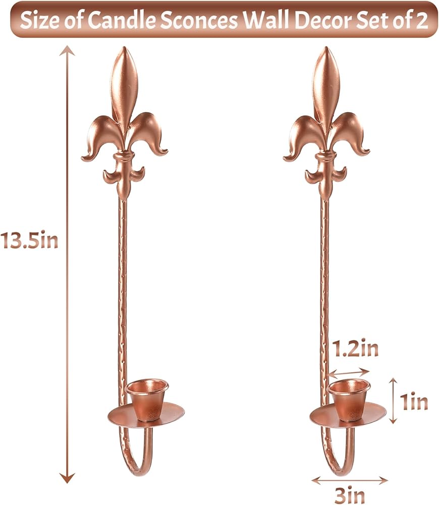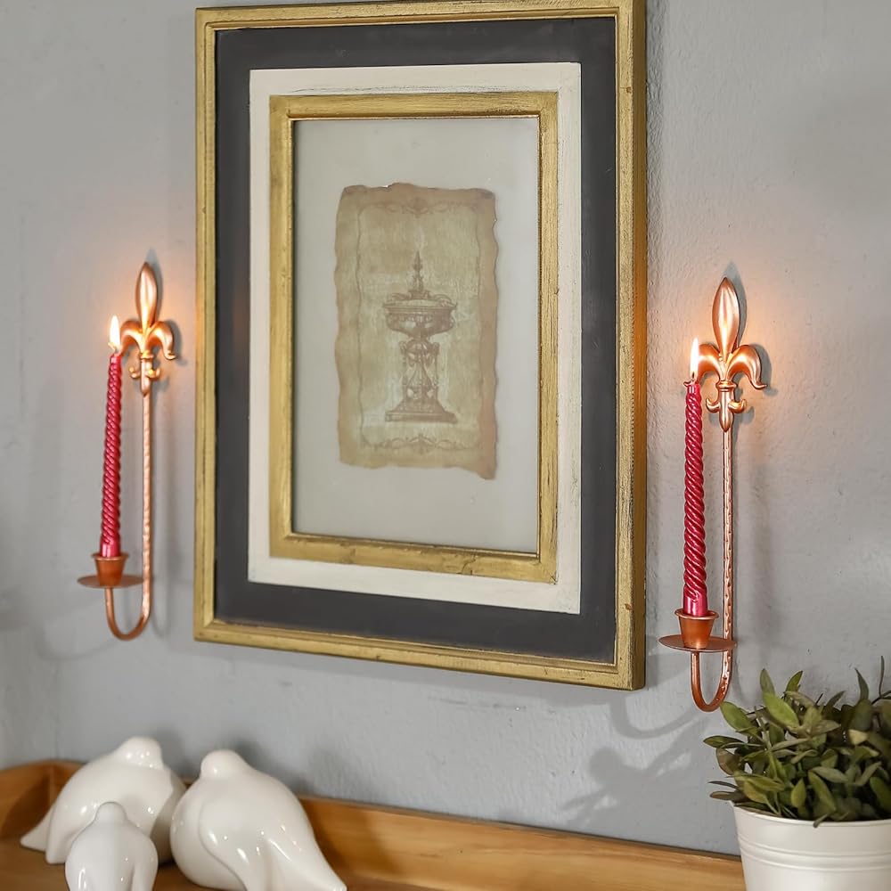 Candle Sconces Set Design: Wall candle sconces design features fleur de lis pattern structure, antique copper color scheme make this 2 pcs wall sconce candle holder full of retro and aristocratic feeling, wall sconce candle holder will surely complement any space decor.