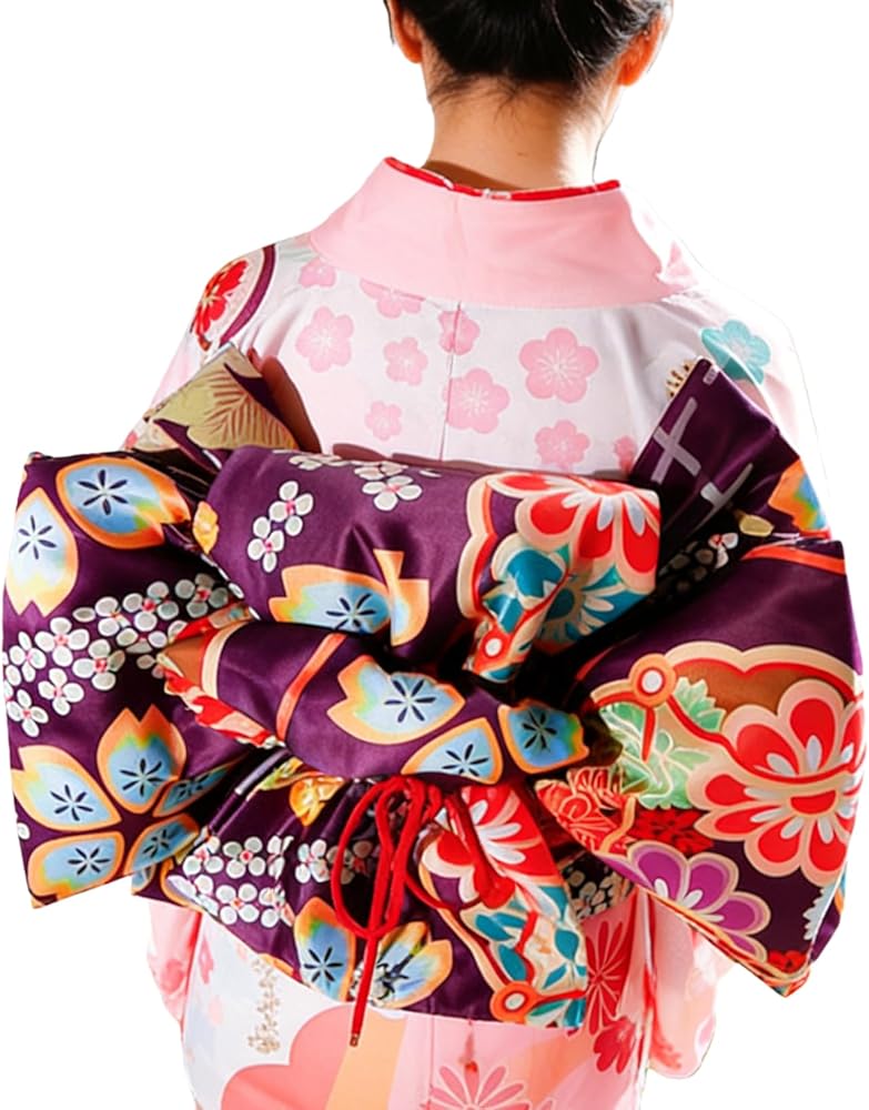 The Japanese obi waistband features a one-piece design and a bow with a hard plastic clip to secure it to the kimono