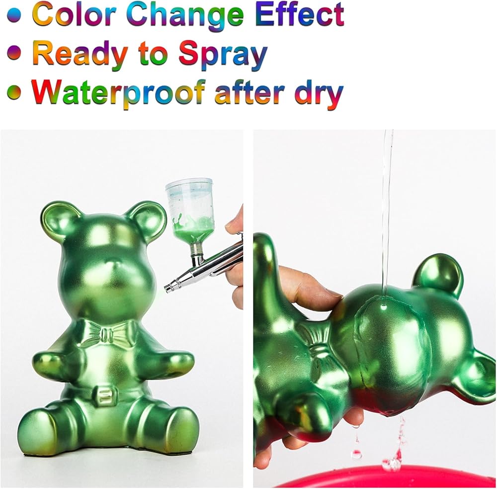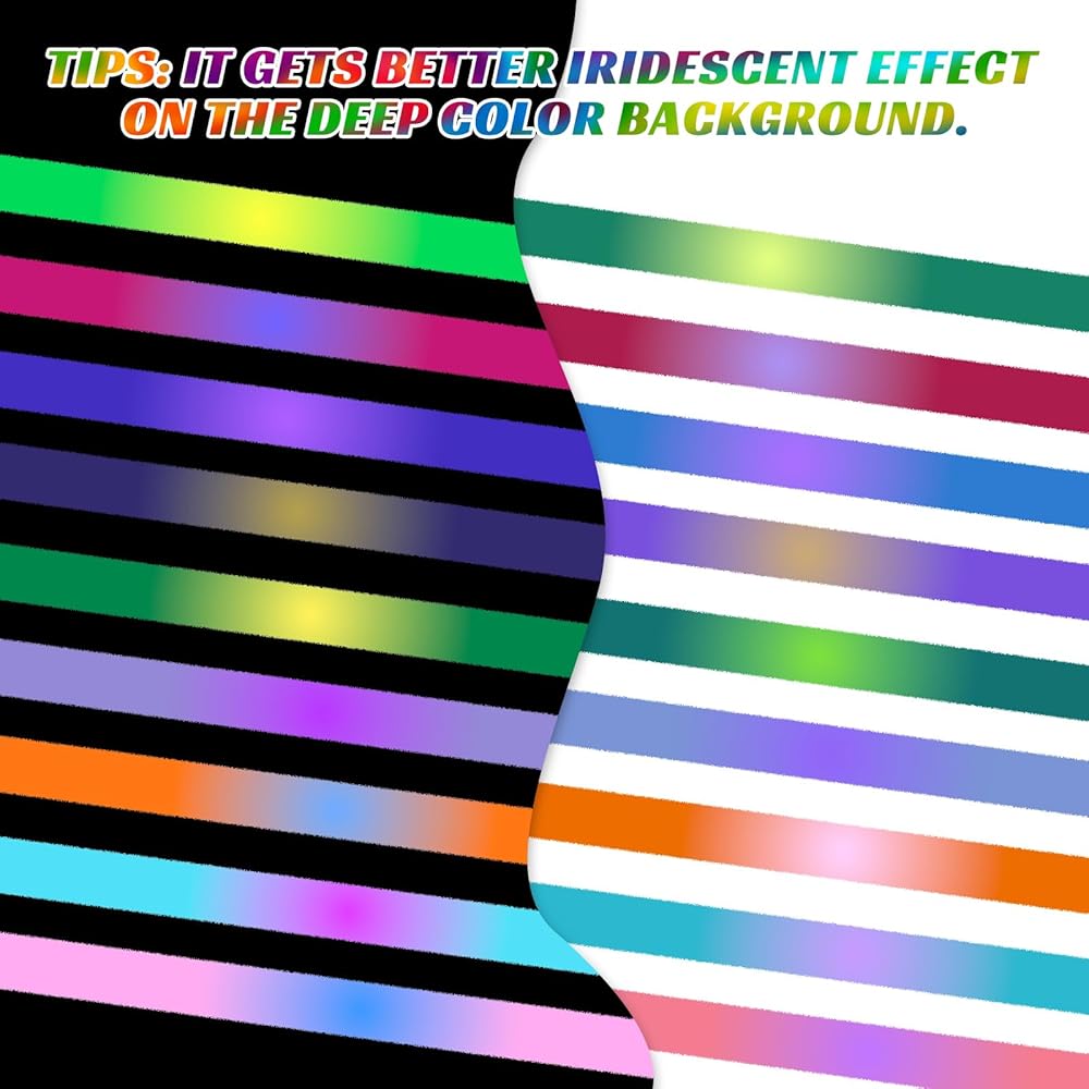 Color Changing Effect: Experience stunning color transitions with HOMY ARTY Iridescent Airbrush Paint. Ideal for artists seeking dynamic, eye-catching results. Each color features iridescent effect with shimmery metallic finish, and shifts with the change of light, background and visual angles. They work better on black surfaces