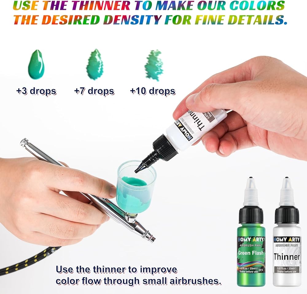 Ready to Spray: Airbrush paints come with high quality air brush flow characteristics and proper ratios,matched well with your airbrush with a smooth consistency and won't clog it up. 2 airbrush thinner to improve color flow through small airbrushes, also make our colors get the desired density for fine details