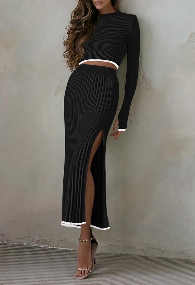 Women knit sweater 2 piece outfits set maxi skirt dress