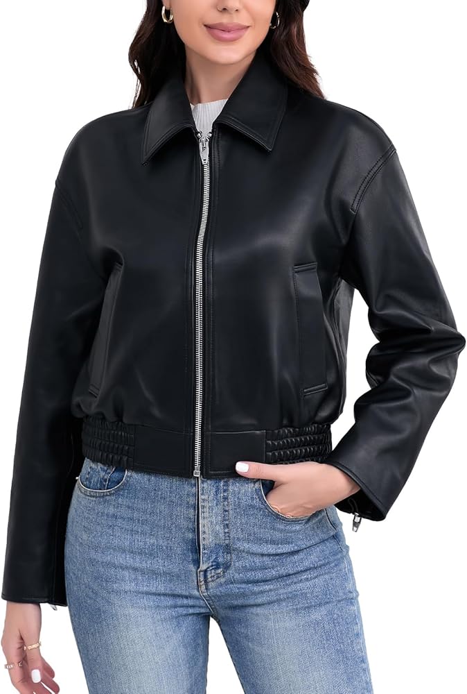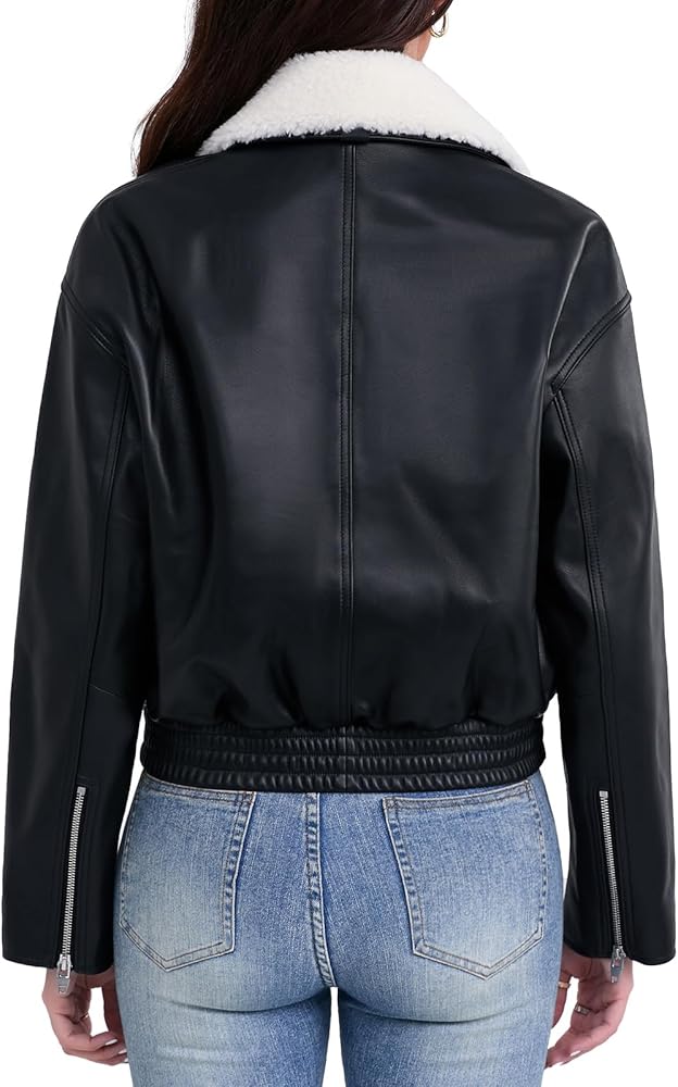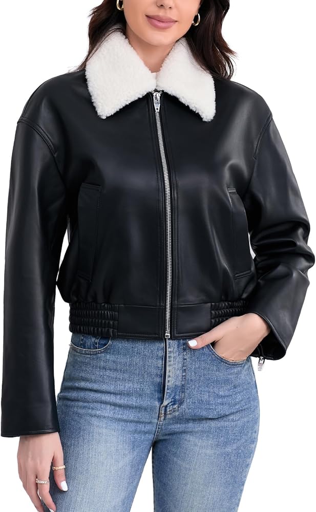 SILVER FASHIONS Leather Jacket Women,Cropped Lambskin Bomber Jacket,Removable Sherpa Collar, Zip Front, Elasticized Hem
