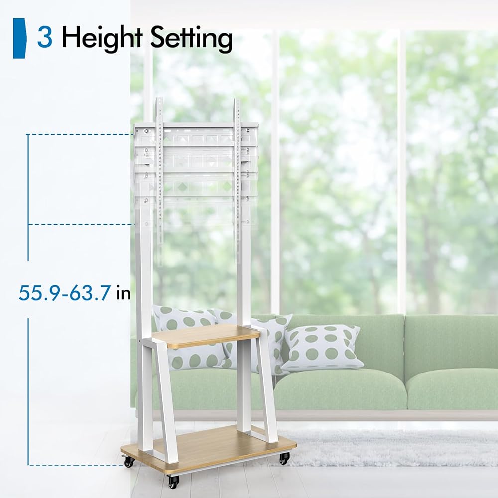 Height Adjustable for Your Eye Level Comfort: Our mobile tv stand on wheels is designed with your viewing experience in mind. The height of the tv cart stand plate center can be adjusted from 55.9” to 63.7”,allowing you to flexibly adjust the height of the TV to get the best visual effects and enjoy a more comfortable viewing experience.