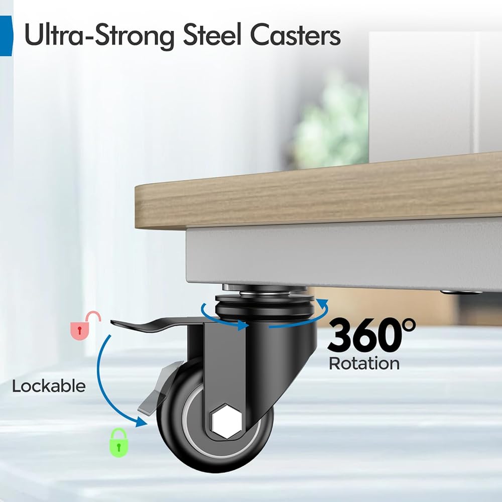 Sturdy and Stable: Our rolling TV stand is made with a stable frame and cold rolled steel metal construction.Easily supports 110 pounds of weight,Provide stable support for TV, The combination of the white metal support pole and the wood grain texture design of the base not only enhances the stylish appearance but also adds a touch of texture to the overall stand.