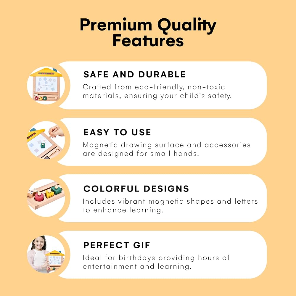 SAFE & EASY TO USE: Our toddler drawing board is crafted from high-grade wood, making it not only durable but also safe for use. The attached magnetic pen and eraser bar make it user-friendly, allowing your child to easily create and erase their drawings