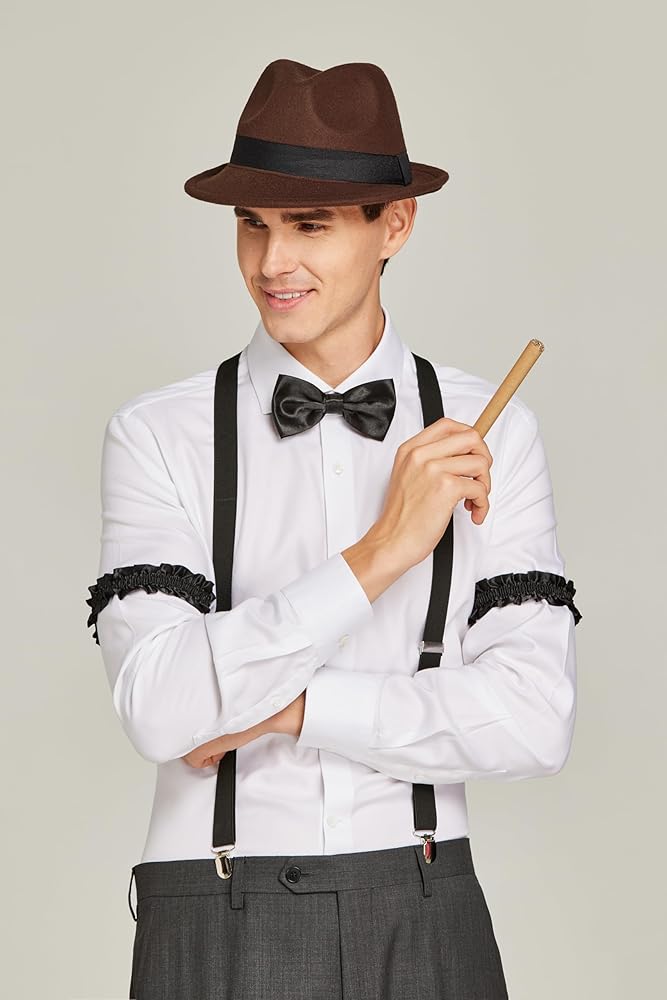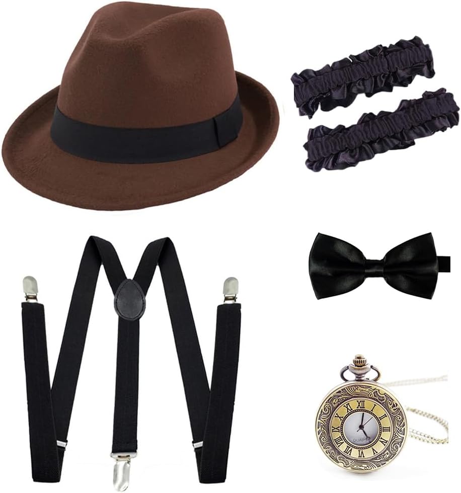 The 1920s costume accessories set includes: 1*felt fedora hat, 1*bow tie, 1*Y-back elastic suspender, 1*paper stick, 1*vintage pocket watch and 1 pair of armband garters. What you see is what you get.