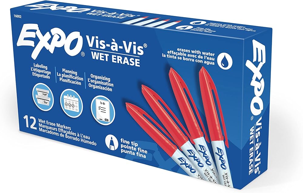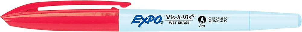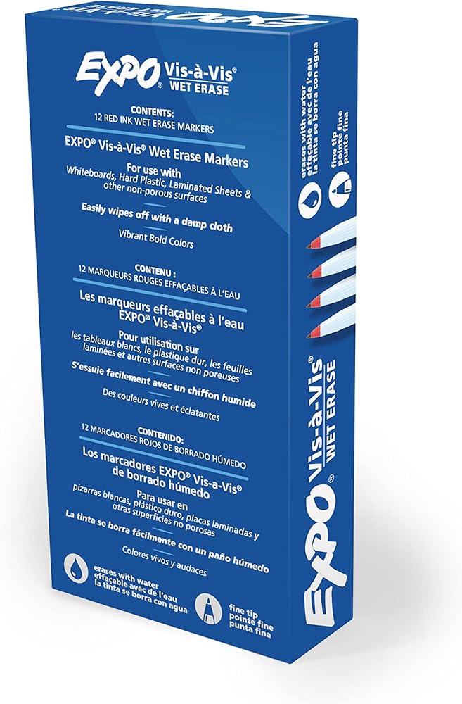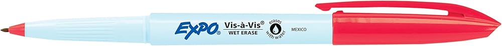 Label, plan, and organize with ease with EXPO Vis-a-Vis Wet Erase Markers. Depend on EXPO wet erase markers for writing or drawing on whiteboards, hard plastic, laminated sheets, and other nonporous surfaces. These EXPO markers feature ink that easily wipes off with a damp cloth. Available in a variety of vibrant colors, the fine-tip markers leave fine detailed lines even in small spaces.
