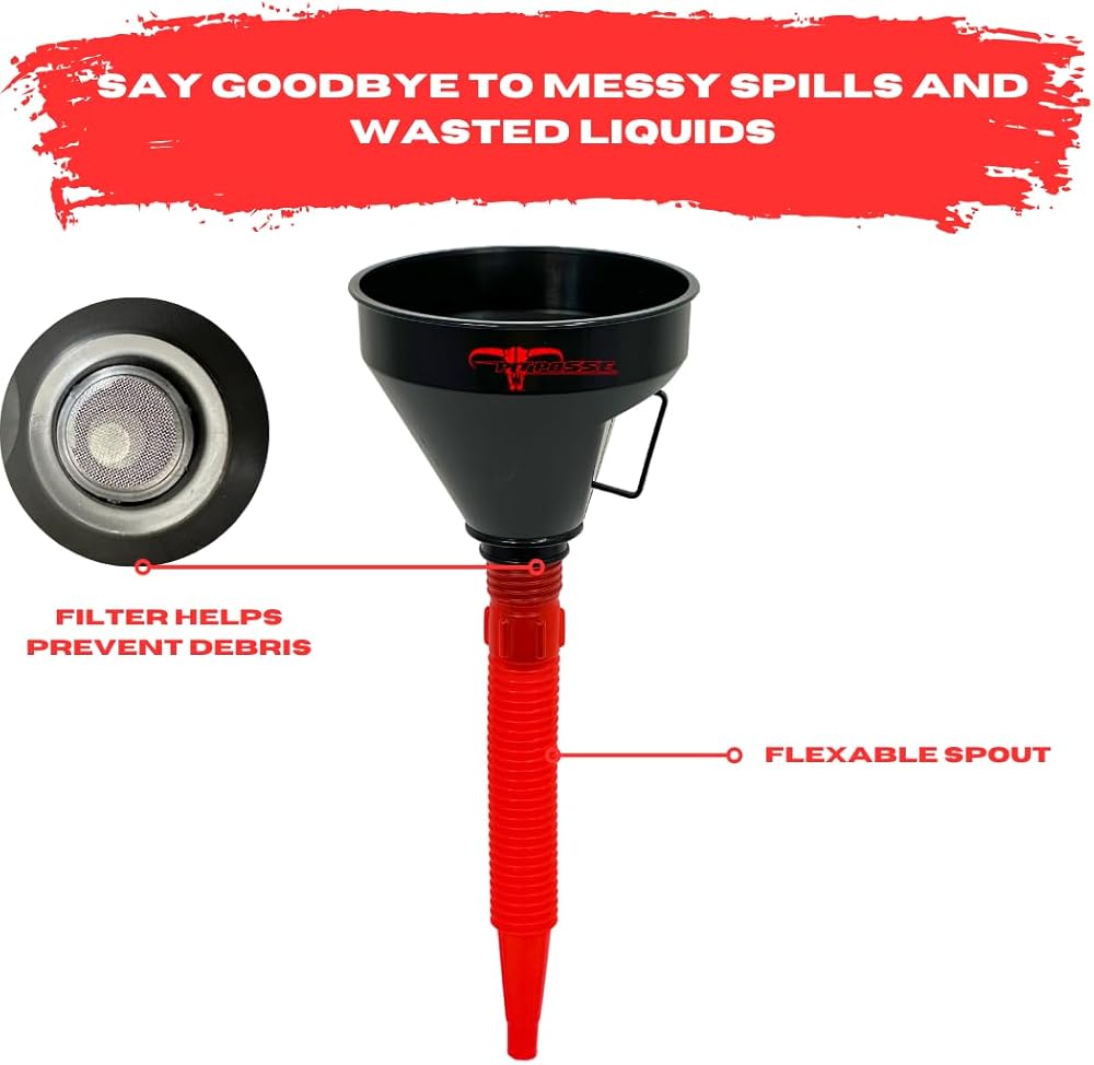 • ✅ Compact and easy to store, this flexible funnel is a practical addition to any toolbox, garage, or workshop. Say goodbye to messy spills and wasted liquids with our Gasoline, Liquids, and Kerosene Flexible Funnel with Extension.