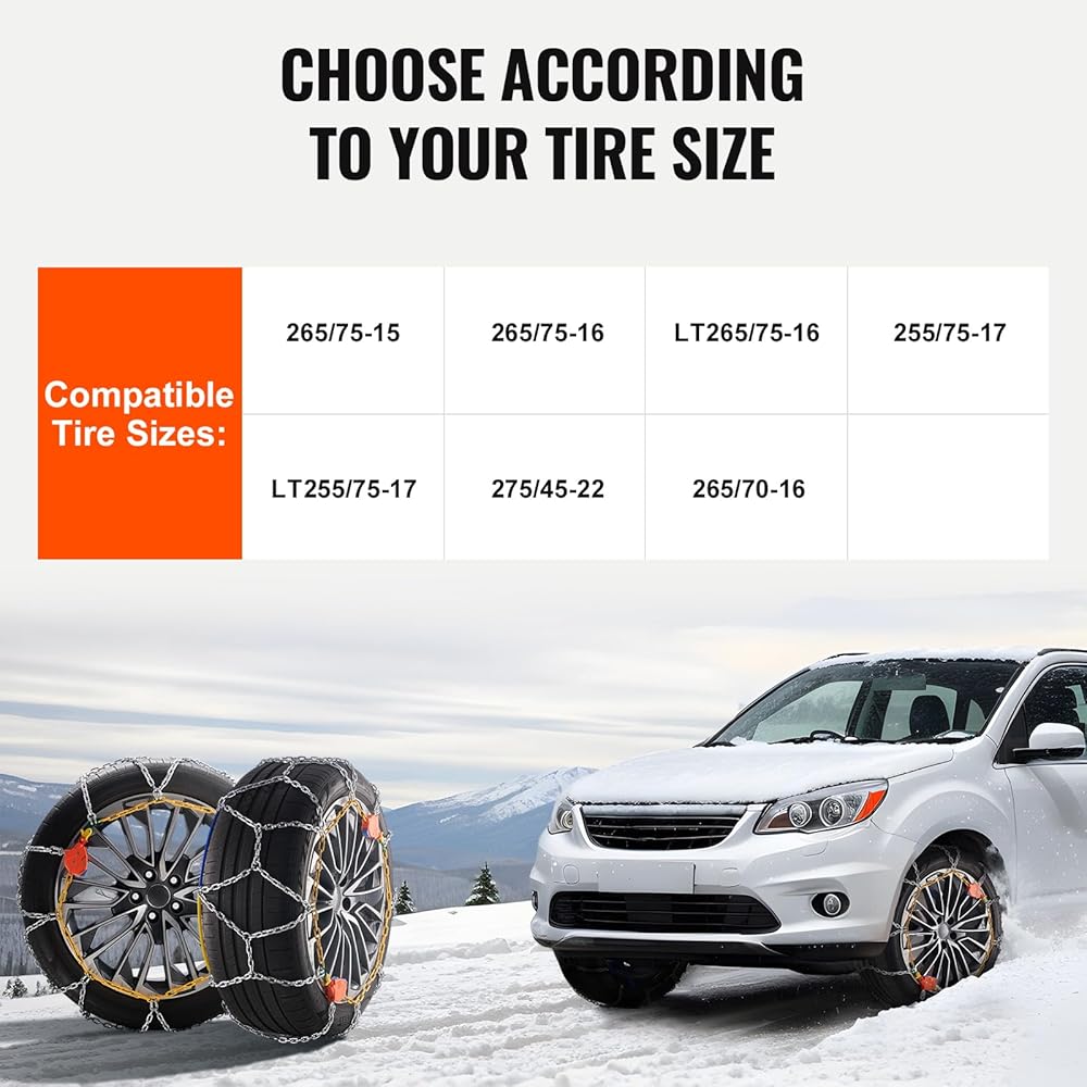 Tire Size Compatibility: These snow chains are compatible with the following tire sizes: LT275/70-17、LT285/70-17、275/65-18、275/60-20、 275/70-18、LT275/65-18、265/70-18、LT265/70-18、 255/70-18、275/55-20. Please verify your tire size to ensure compatibility, and install the chains as tightly as possible for optimal performance.