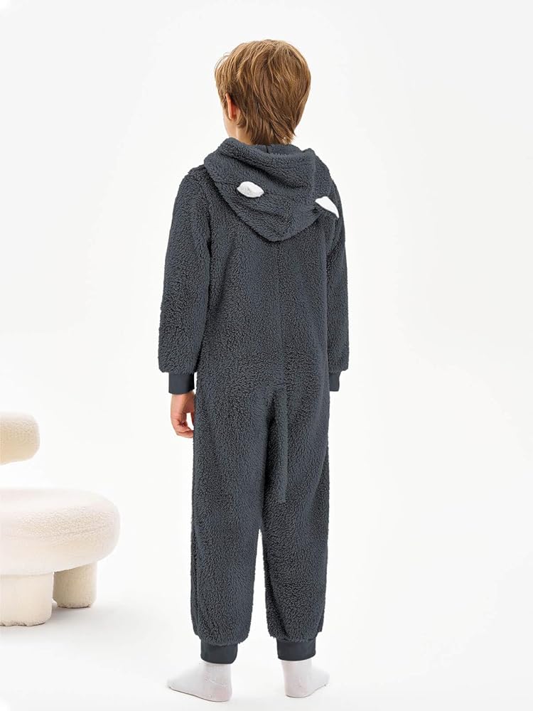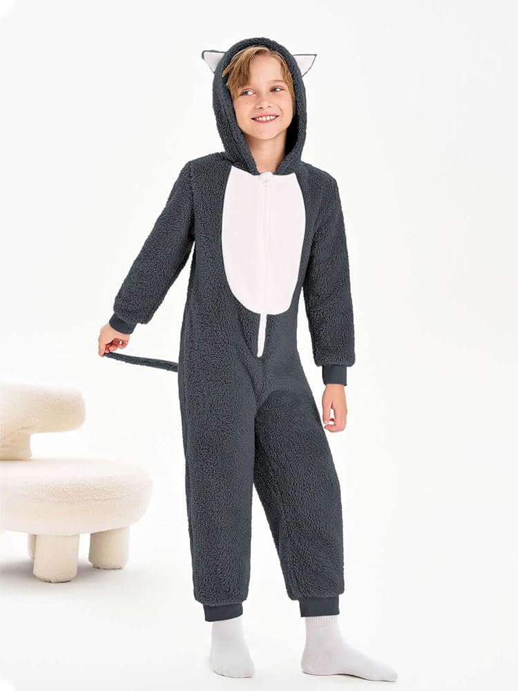 Feature: Boys' sleepwear, long sleeve onesies, ribbed edge for add warmth, hooded with cute cat-ear detailing, and hip with tail, zip up front, easy to wear on and off