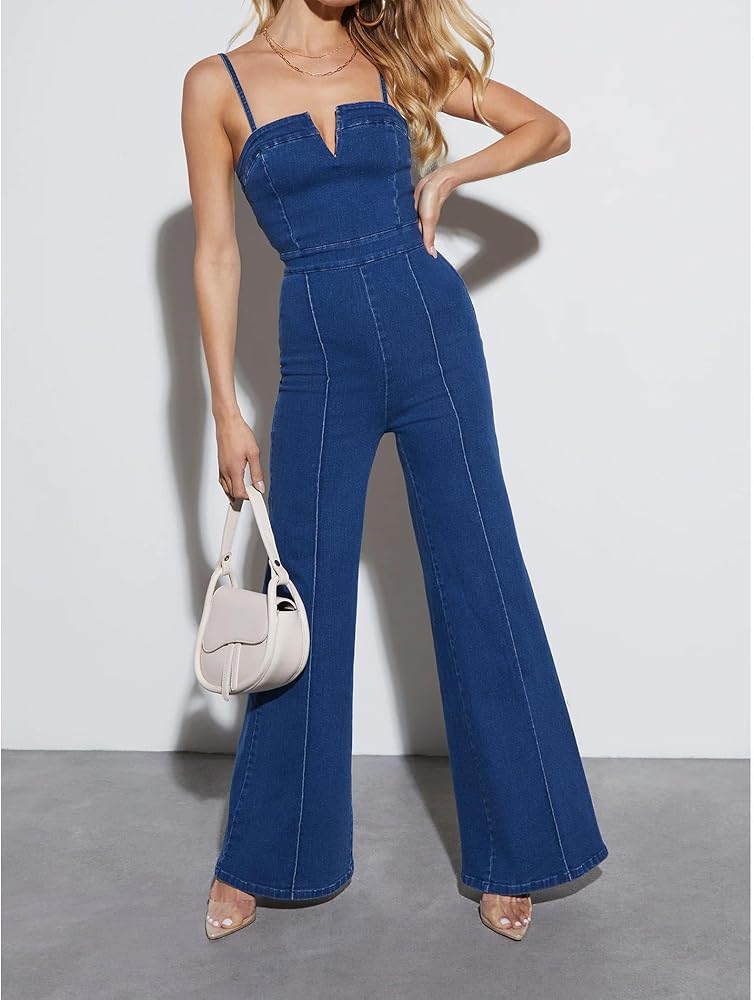 ★☆Features&Design☆★ Sleeveless, Spaghetti Straps, V-Neck, Back Zipper Closure, Solid Color, Wide Leg, Flared Pants, One Piece Denim Jumpsuit, Blue Jeans Overalls, Elegant Romper Outfit