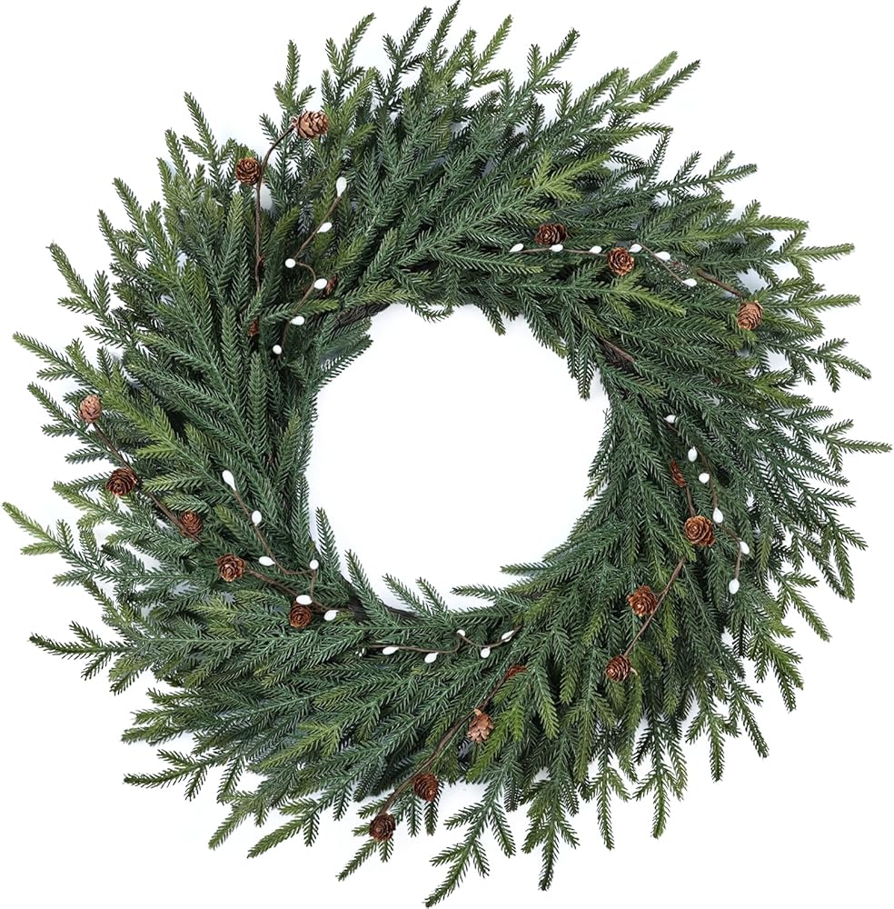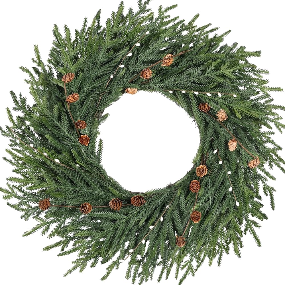 Premium Materials: This artificial pine wreath is made from quality polyethylene (PE) materials and features a sturdy grapevine base for durability. The pine wreath can be easily shaped and customized, making it a great choice for those seeking a faux pine wreath that will last through many holiday seasons