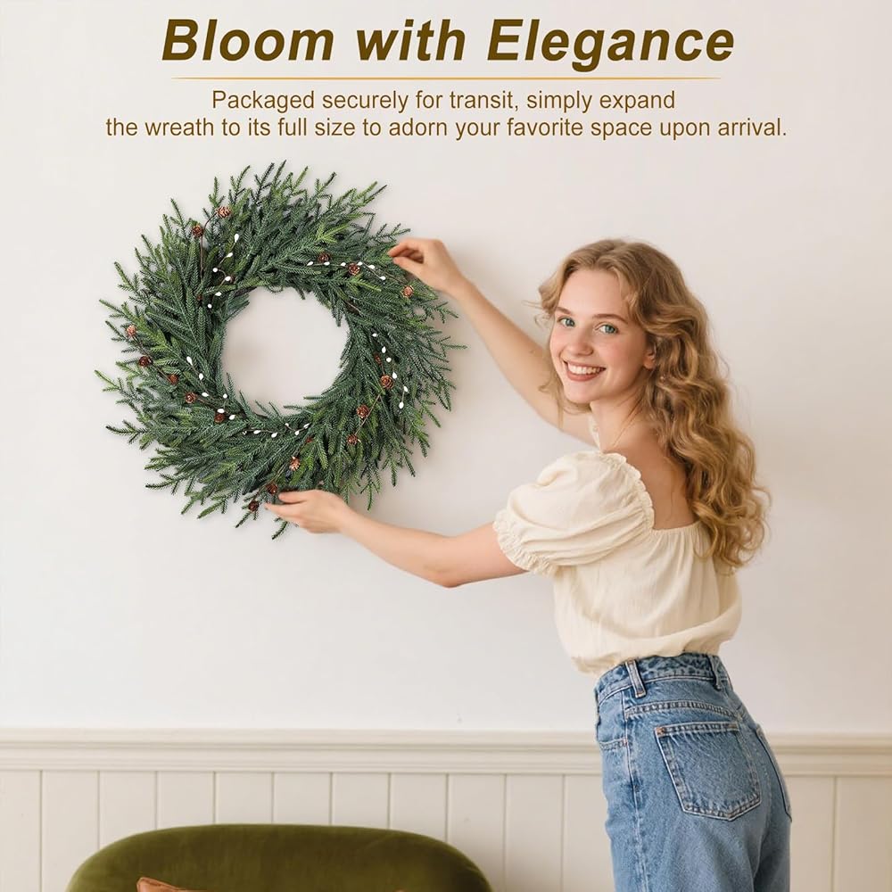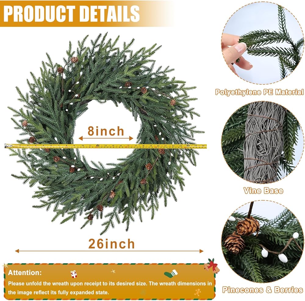 26 In Christmas Wreath: Measuring 26 inches in diameter, this green wreath for front door is large enough to make a statement yet versatile enough for any space. Whether it's displayed as a front door wreath, a Christmas wreath for mantle, walls, or used in a farmhouse wreath display, it enhances any holiday decor effortlessly