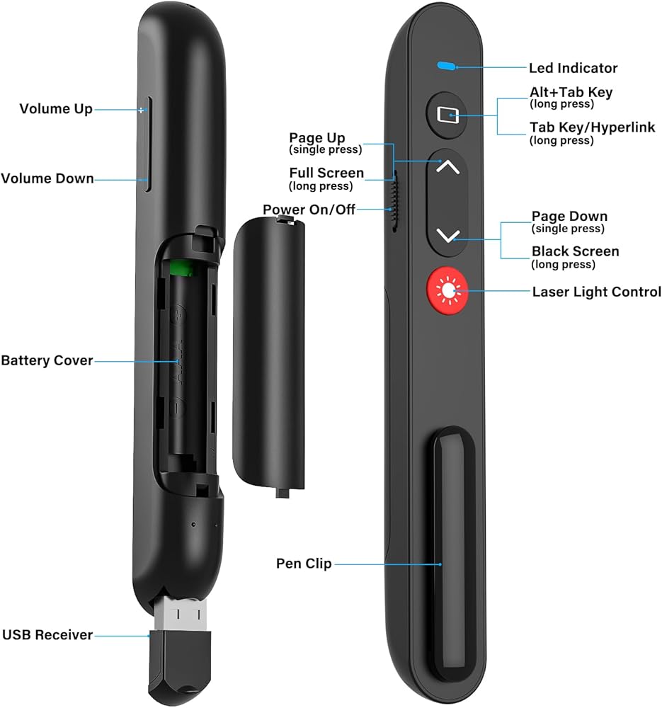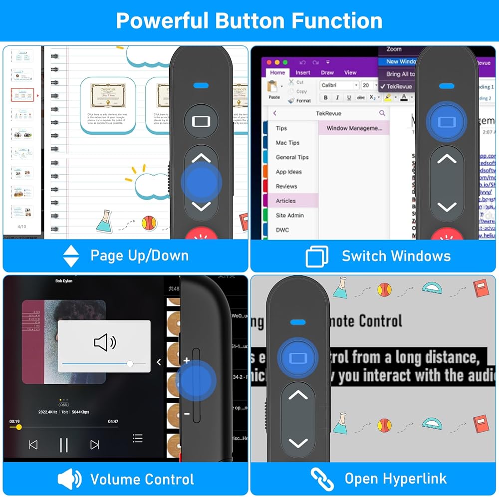 Powerful Button Fuction for Presentation Clicker: This powerpoint clicker support volume control, switch windows, full/black screen, page up/down. Press the left button and right button at the same time can switch the button function, it can be turn left/right(The default value is Page Up/Page Down). One button is one function, The contoured keys are located in just the right place and easy to find by touch. With this clicker, which can allow your presentation goes smoothly