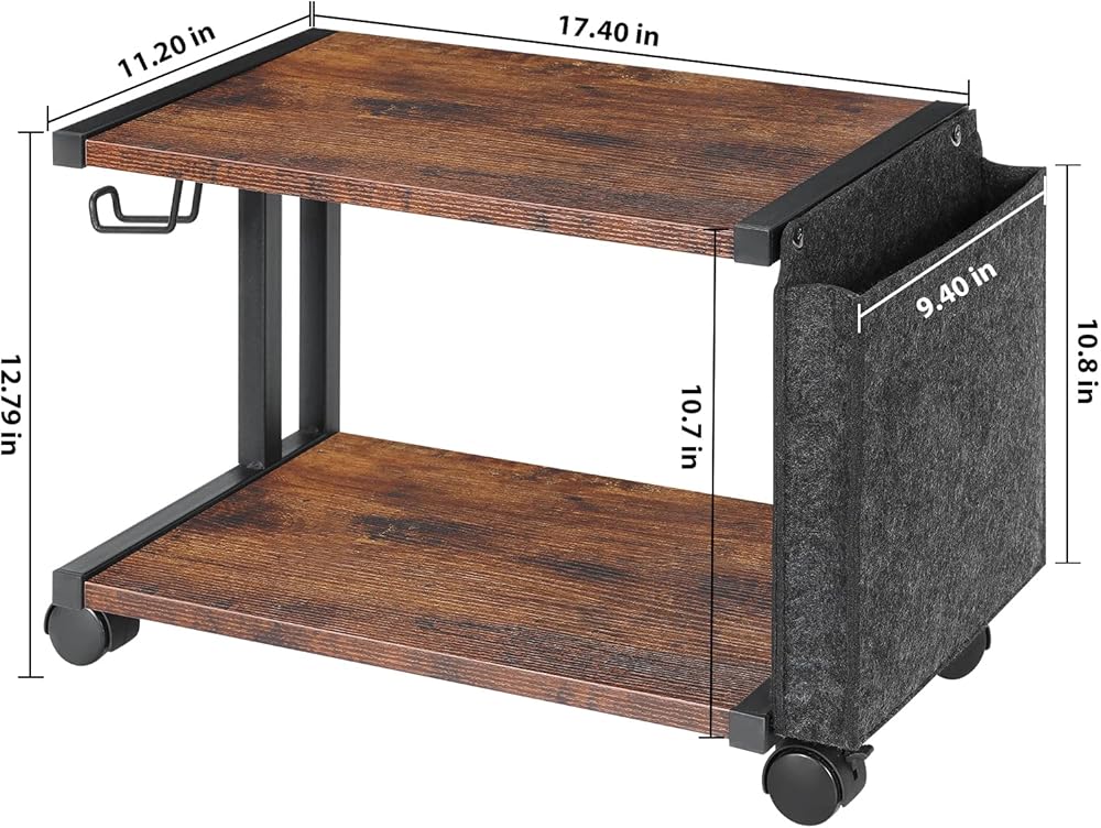 Printer Cart on Wheels: Comes with 4 360°swivel wheels allow for easy movement on carpets, designed to improve mobility; and two lockable wheels can stay still when needed, designed to improve stability, the wheels with strong load-bearing capacity not easy to damage or fall off