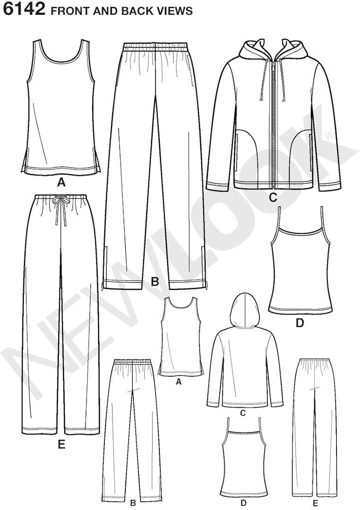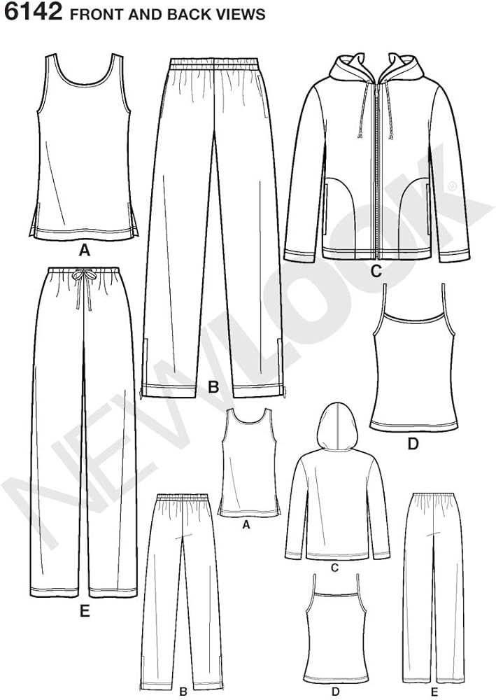 Unisex Activewear sewing pattern. New Look pattern 6142, part of New Look Winter 2001 Collection. Pattern for 5 looks. For sizes A (All Sizes).