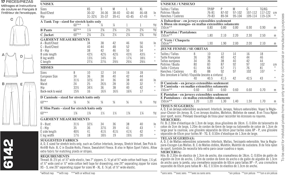 Suggested fabrics: A, D, E sized for stretch knits only, such as Cotton Interlock, Jerseys, Stretch Velvet; see Pick-A Knit Rule; B, C in Double Knits, Fleece, Sweatshirt Fleece; B also in Nylon Sport Fabric