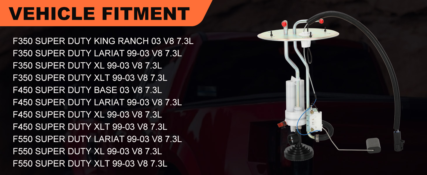 【Applicable Models】: Our ford f-350 7.3 fuel tank sending unit is suitable for specific models. It is compatible with the 1999-2003 ford f-350, f-450, F-550 Super Duty Chassis Cab V8 7.3 L series models. And, 1999 f-450 7.3 fuel tank sending unit fits Diesel Turbo models and midship Tank models only. Please make sure your car's information matches the 1999 ford f350 diesel fuel sending unit we provide to ensure installation, such as:brand, model, and year