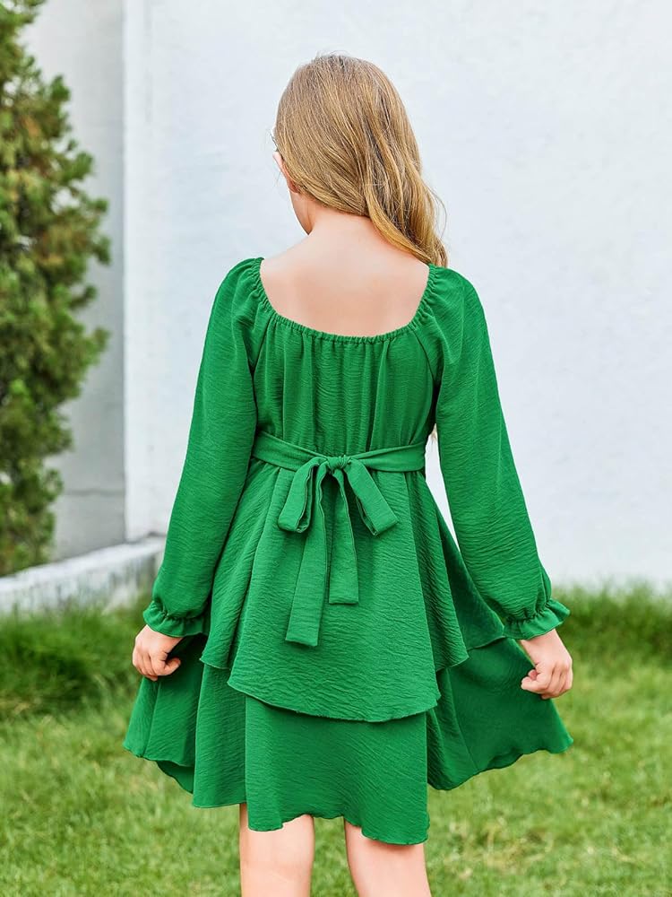 Feature: Girls party dress features an elastic neckline that offers the flexibility of a square neckline and off-the-shoulder style. Cute and sweet ruffled puff sleeves, fashionable adjustable cross belt and A-line layered flared ruffled flowing hem highlight the girl's elegance. Smocked bodice and high-rise waist enhance the fit of the dress