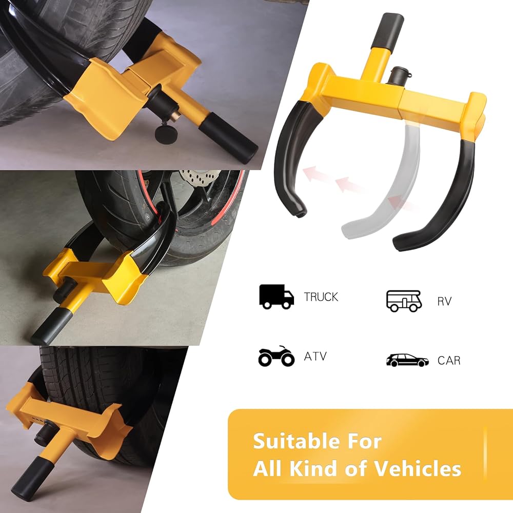 Universal Design:Universal wheel locks adjustable for 7-11 inch tires, fits most cars, trucks, trailers, motorcycles, ATVs, RVs, golf carts, etc.