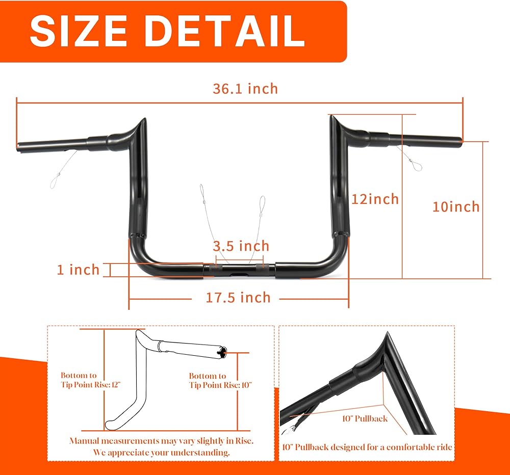 Fitment: This Ape Hanger fits for 1996-2023 Touring Models with Batwing Fairing(FLHT electra glide, FLHX street glide, FLHTC electra glide classic, FLHTCUI ultra classic electra glide, Tri-glide models) Width: 36.1", Pullback (depth): 10", Rise: 10", Clamp Diameter:1", Bar Diameter: 1.5", Base Width: 17.5"